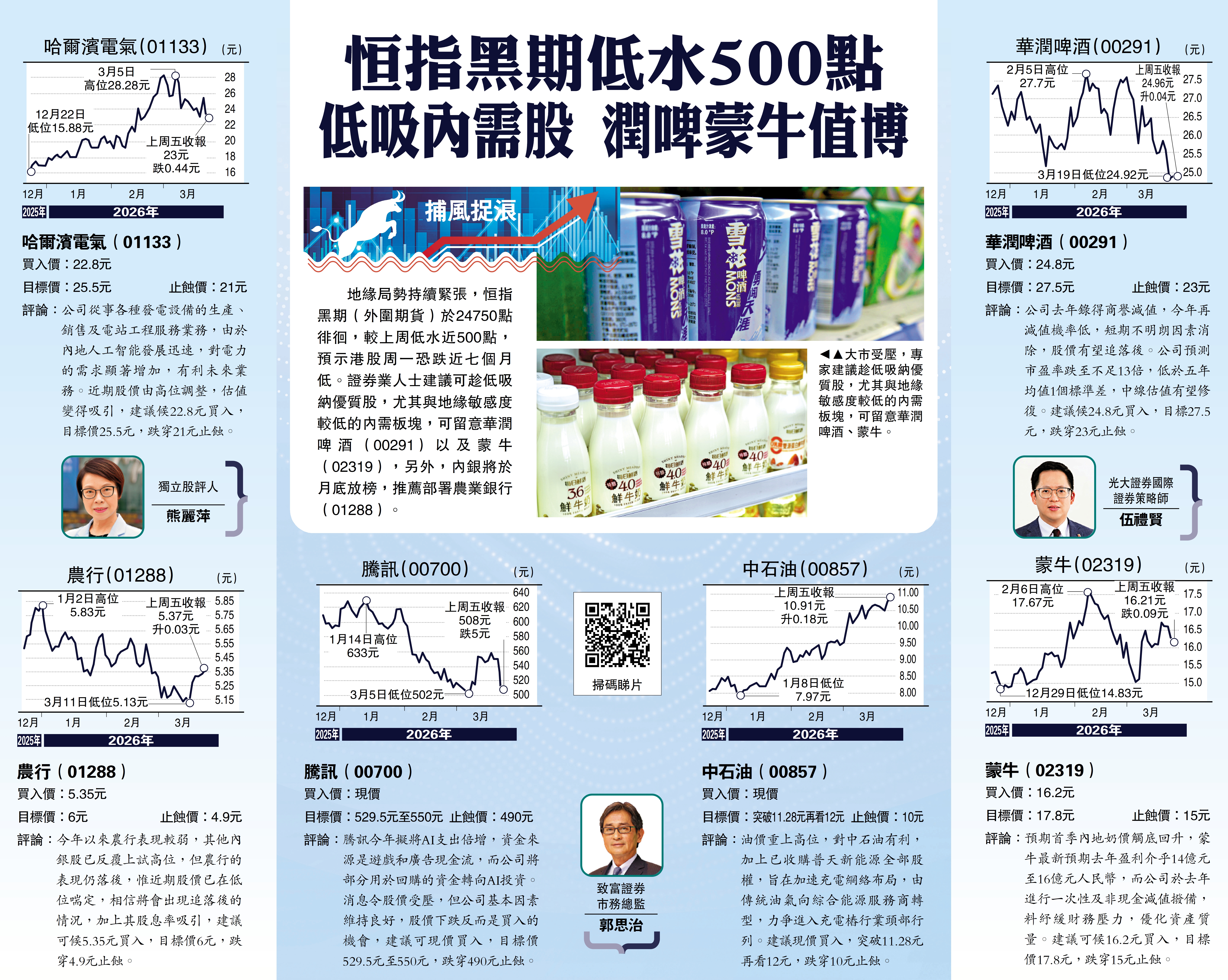 捕風捉浪/恒指黑期低水500點 低吸內需股 潤啤蒙牛值博