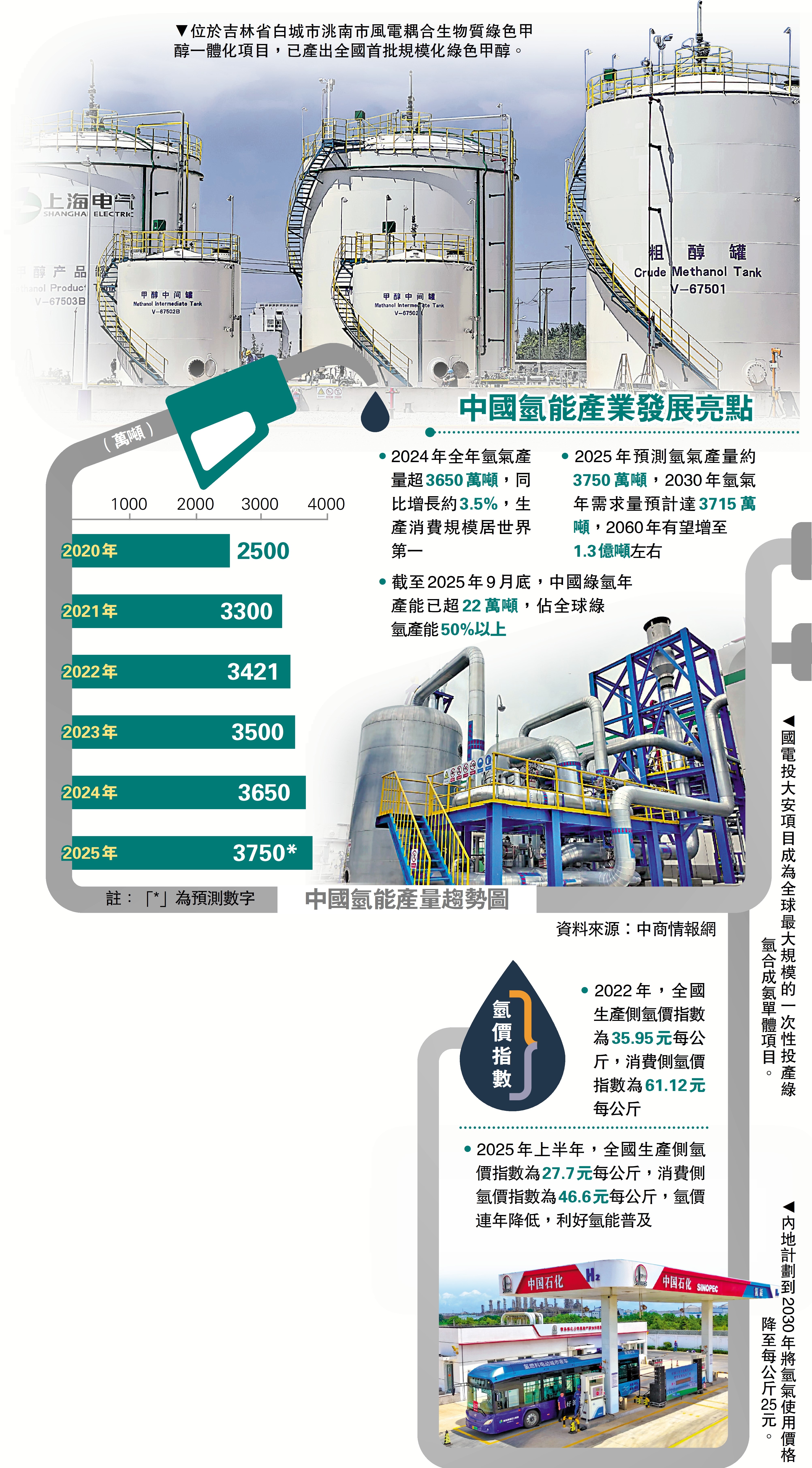 數據顯示,中國氫能2024年全年生產消費規模已超3650萬噸,佔全球總產量的36.6%,連續多年位居世界第一。\大公報記者 盧冶 林凱