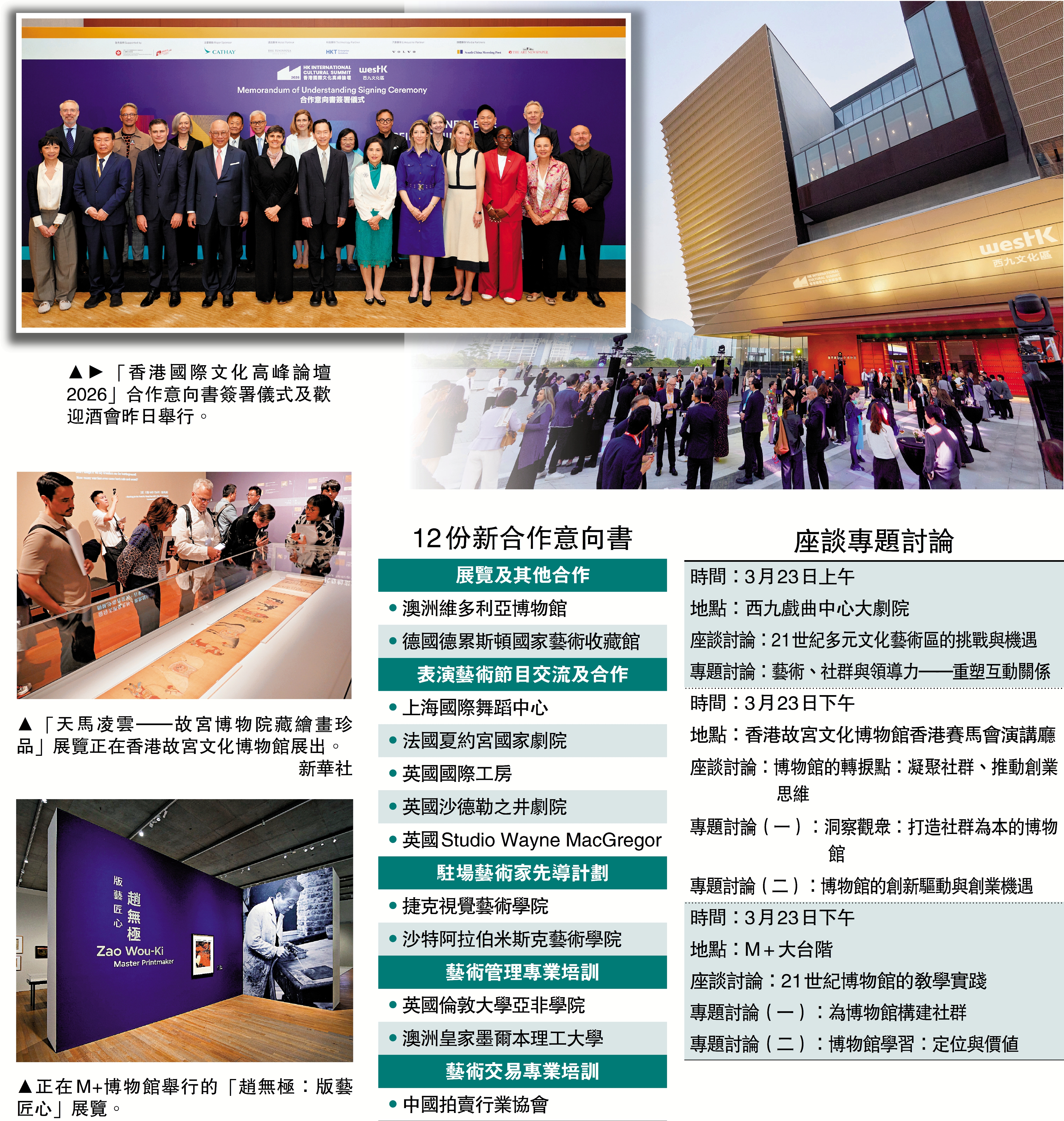 逾150位來自海內外頂尖文博機構的嘉賓代表昨日(22日)出席於香港故宮文化博物館舉行的「香港國際文化高峰論壇2026」(高峰論壇)合作意向書簽署儀式及歡迎晚宴,為一連兩日的第二屆「香港國際文化高峰論壇」揭開序幕。西九文化區管理局當晚與全球12間頂尖文博機構簽訂合作意向書。