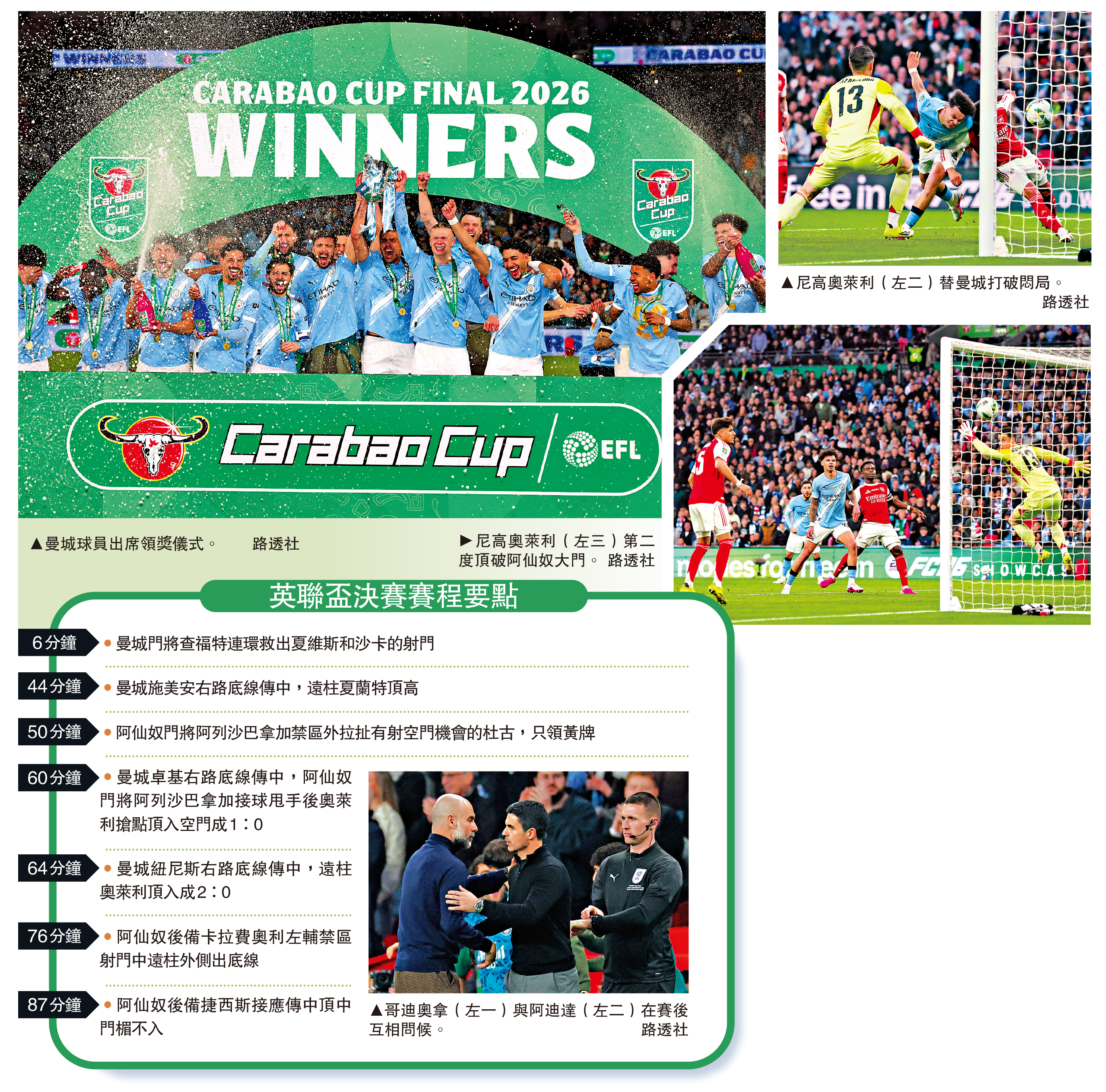 香港時間23日凌晨在溫布萊球場上演的英格蘭聯賽盃決賽,被看低一線的曼城在經驗豐富的主帥哥迪奧拿完美布局下,憑年輕左閘尼高奧萊利下半場的5分鐘內頂入2球,最終以2:0打敗由徒弟阿迪達帶領的阿仙奴,前者更成為首位5奪英聯盃的主帥,反觀阿迪達在排陣、戰術以至臨場調動均棋差一着,過分畏首畏尾之下,終未能拿到近6年來的第2個錦標,創「四冠王」歷史之夢亦告破滅,更令人憂慮是打擊了球隊信心,影響4月英超作客曼城的另一場「天王山決戰」。\大公報記者 譚德龍