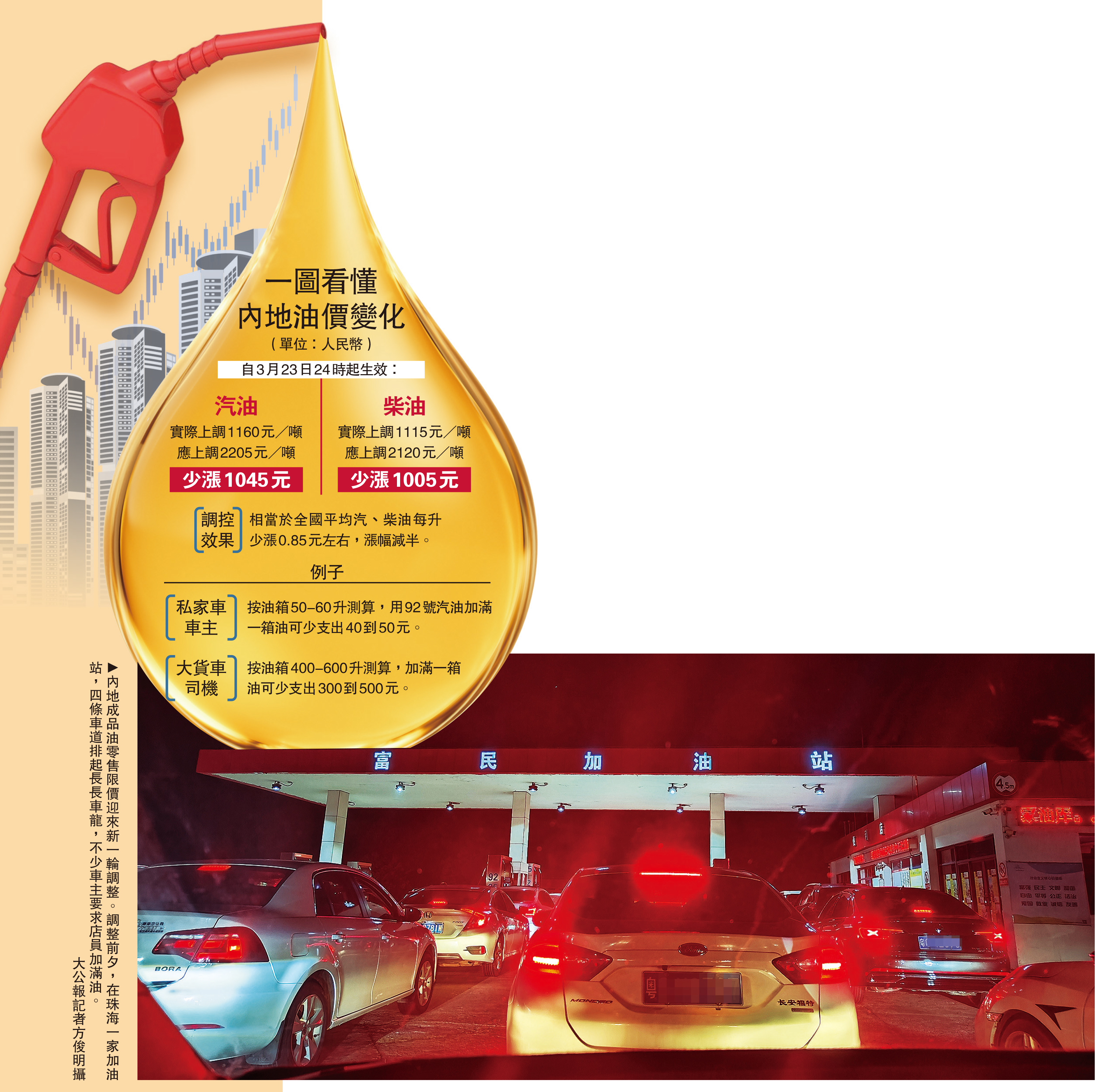 近年來,內地成品油價格一直按現行機制調整,本次是2013年現行機制實施以來的首次調控。根據現行價格機制計算,自3月23日24時起,國內汽油、柴油價格(標準品)每噸分別應上調2205元(人民幣,下同)、2120元,調控後實際上調1160元、1115元,相當於漲幅減半。