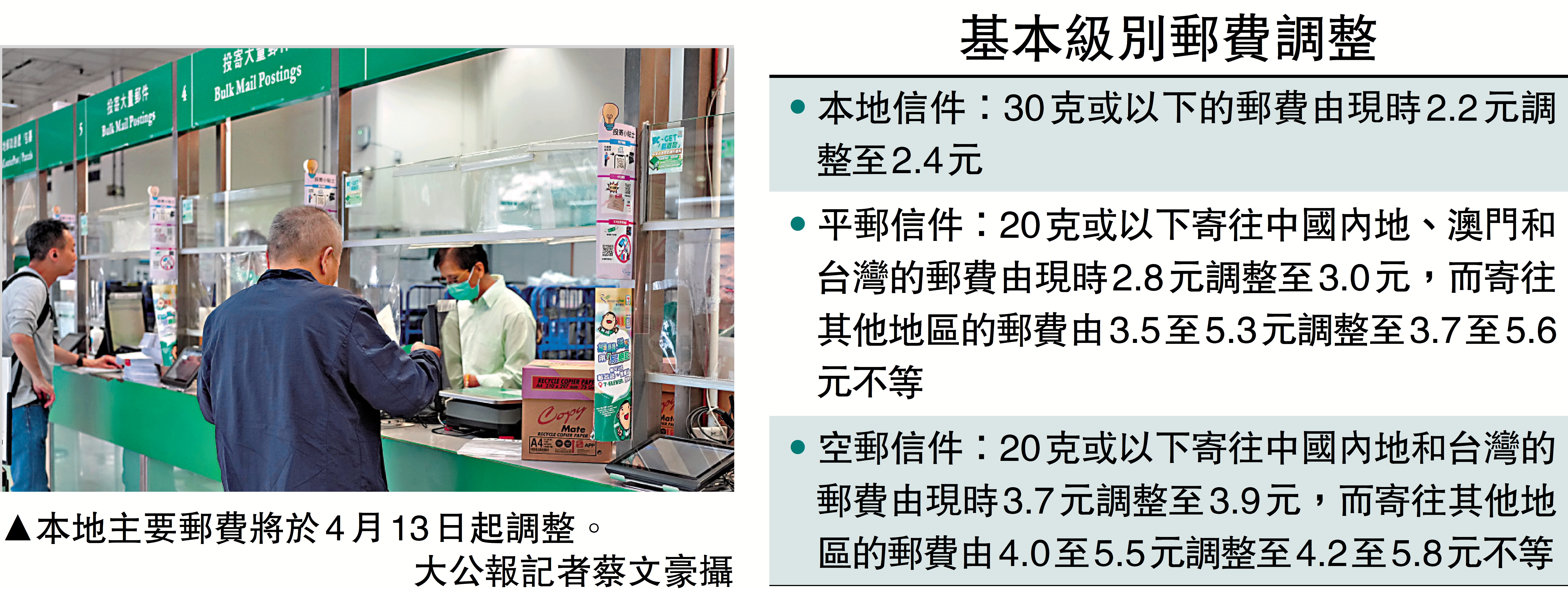 在投遞信件方面,有關基本級別郵費調整大致如下:30克或以下的本地信件,郵費由2.2元加至2.4元;20克或以下寄往中國內地、澳門和台灣的平郵信件,由2.8元加至3元;而空郵信件,由3.7元加至3.9元。