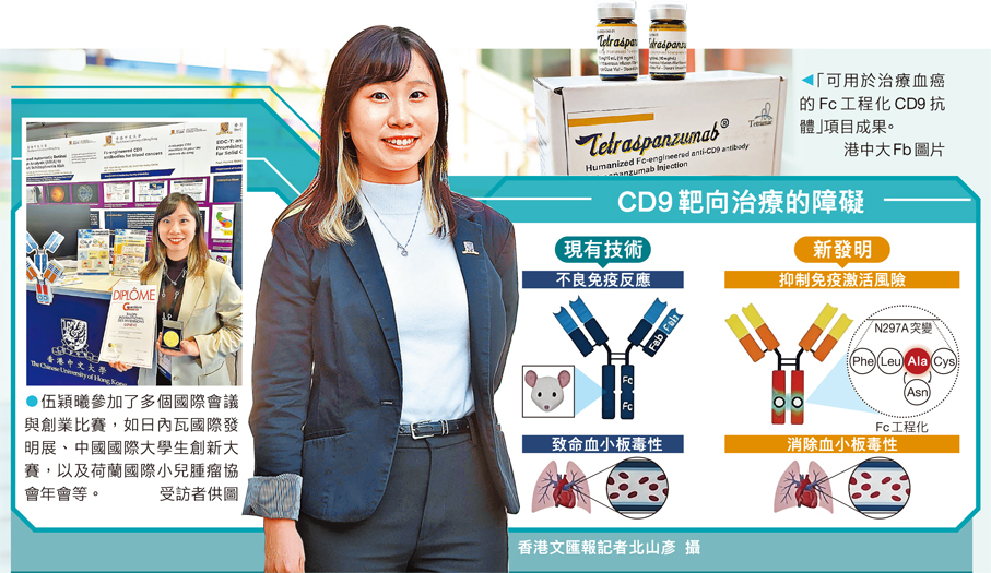 國家「十五五」規劃綱要明確支持香港建設國際創新科技中心,並提出加快包括生物醫藥在內的戰略性新興產業發展,投身醫療科研的香港青年將迎來重大機遇。香港中文大學博士畢業生及博士後研究員伍穎曦,成功研發出嶄新的Fc工程化CD9抗體,開創出血癌甚至其他實體腫瘤的免疫治療新路向,先後獲得多個本地和國際級科研發明獎項,近日更成為港中大年度傑出學生獎「創新與發明」得主。她與團隊亦為此創辦生物科技初創公司,推動全球首款CD9靶向生物製劑的臨床轉化,結合科研成果與產業實踐,生動展現香港作為國際創科中心的優良環境與多元支持。