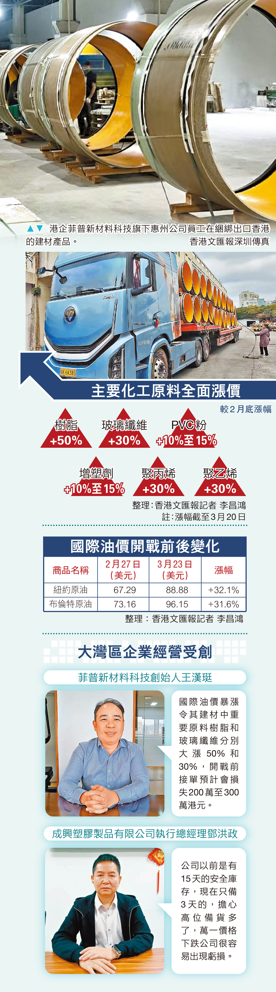 在深圳和惠州從事高科技建材生產銷售業務的港企菲普新材料科技創始人王漢珽最近不斷哀嘆,國際油價暴漲,令其建材中重要原料樹脂和玻璃纖維分別大漲50%和30%,而這兩種材料已佔產品成本70%。2月底開戰之前的訂單價格早前已經確定,沒有辦法,只得自己消化,因此損失了200萬至300萬港元。