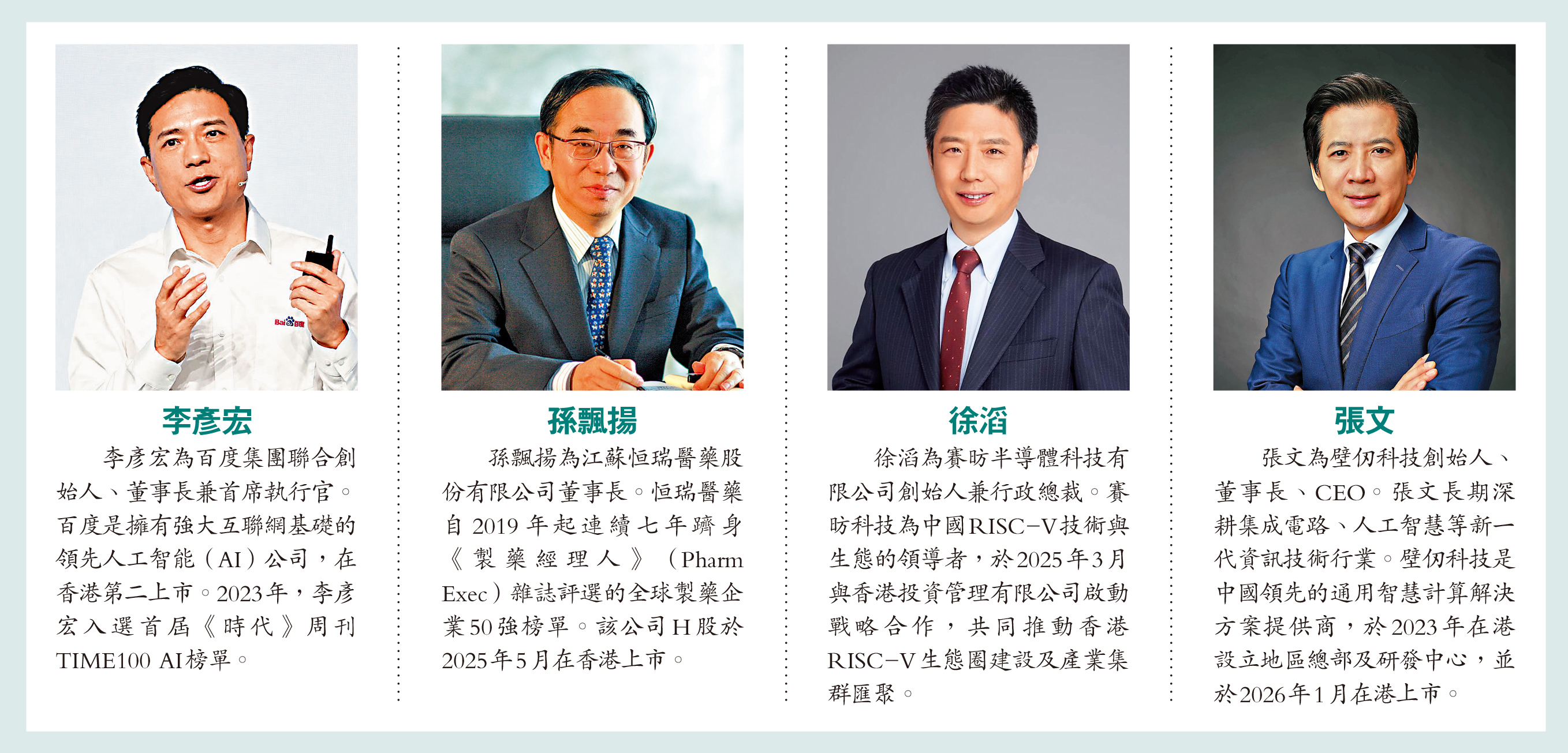 是次獲委任的四人均來自科技企業。根據公開資料,百度是擁有強大互聯網基礎的領先人工智能(AI)公司,在美國納斯達克上市,並在香港第二上市。恒瑞醫藥是全球領先的創新型製藥企業,自2019年起連續七年躋身《製藥經理人》(Pharm Exec)雜誌評選的全球製藥企業50強榜單,以「A+H」模式在上海和香港兩地上市。賽昉科技為中國RISC-V技術與生態的領導者,於2025年3月與香港投資管理有限公司啟動戰略合作,共同推動香港RISC-V生態圈建設及產業集群匯聚。壁仞科技是中國領先的通用智慧計算解決方案提供商,於2023年在香港設立地區總部及研發中心,並於2026年1月於香港上市。