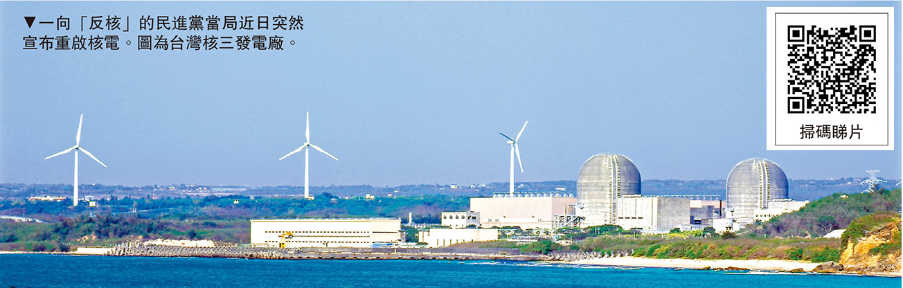 【大公報訊】綜合環球網及台媒報道:賴清德最近宣布台當局已確認核二、核三廠具備重啟條件,台電預計將在3月底前正式將重啟計劃送交「核能安全委員會」審議。賴清德的話等於親口宣告蔡英文的「非核家園」終止,在島內掀起軒然大波。但賴清德狡辯稱,蔡英文2016年上台後推動綠能產業,包括風力發電、太陽光電,所發電量已取代核一、核二、核三廠原來的發電量。核三廠2號機在2025年5月17日停止運轉後,台灣就成功達到「非核家園」的目標,「並沒有轉彎」。