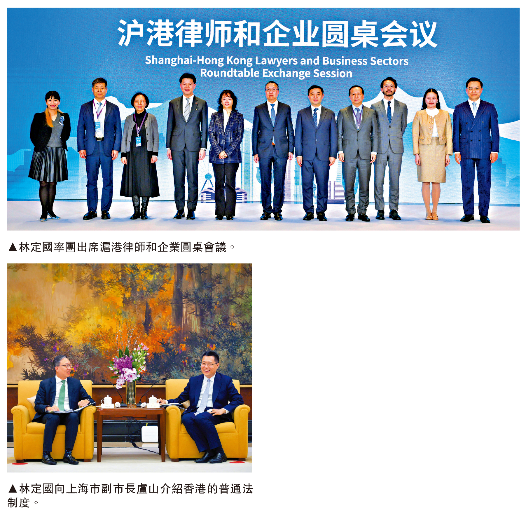 林定國23日展開在上海的訪問行程,上午與上海市司法局黨委書記、局長顧全會面,就加強兩地法律和仲裁調解業界的專業合作和涉外法律人才交流培訓等工作交流意見。當天下午,林定國一行出席滬港律師和企業圓桌會議及交流晚宴,推廣香港作為國際金融中心和國際法律樞紐,可發揮其普通法制度和法律及爭議解決服務的優勢,協助內地企業出海。與會者就內地企業出海趨勢、有關以香港作為融資平台的法律事宜、管控跨境交易和投資的法律風險,以及處理涉外商業糾紛等議題作出深入交流。