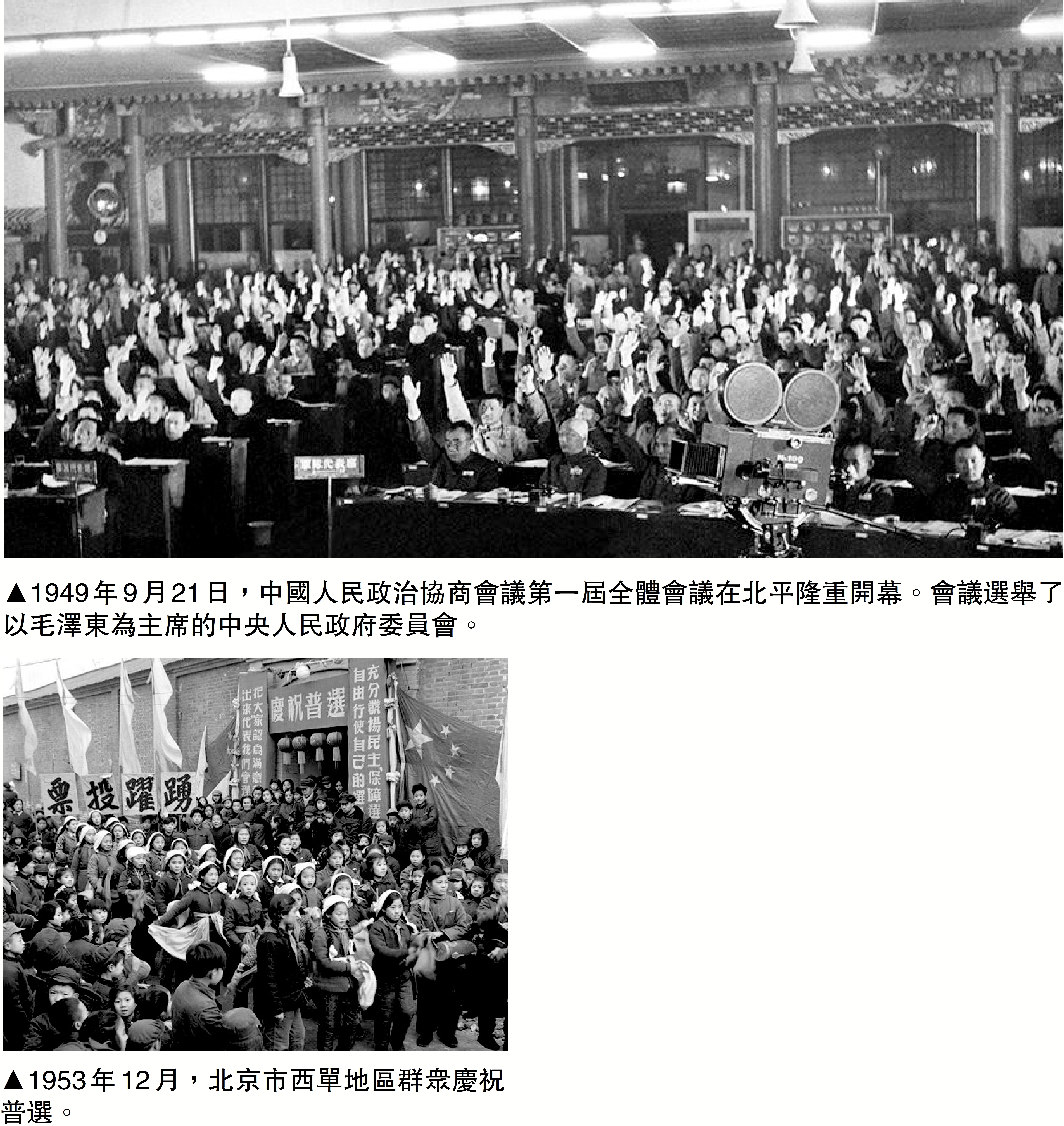 1954年9月,第一屆全國人民代表大會第一次會議在北京舉行。大會的一個重大貢獻是一致通過了《中華人民共和國憲法》。這是一部社會主義類型的憲法,體現了人民民主原則和社會主義原則,以根本法的形式確認了近代100多年來中國人民為反對內外敵人、爭取民族獨立和人民自由幸福進行的英勇鬥爭,確認了中國共產黨領導中國人民奪取新民主主義革命勝利、中國人民掌握國家權力的歷史變革,確定了中國人民行使當家作主權利的政治制度,指明了為建立社會主義社會繼續奮鬥的正確道路。