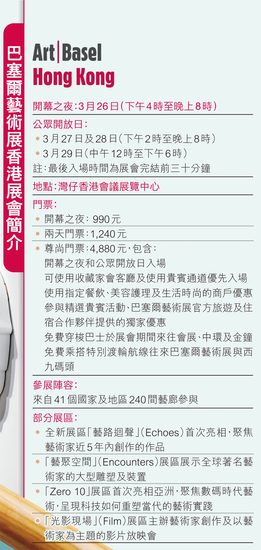 羅淑佩昨日在出席巴塞爾藝術展香港展會開幕酒會時表示,巴塞爾藝術展香港展會2013年首次落戶香港以來,已成為香港最負盛名的旗艦藝術盛事之一,去年為期5天的展會吸引42個國家及地區240間畫廊參與,共吸引86,500名訪客,逾半數為訪港旅客。展望未來,文體旅局與巴塞爾藝術展香港展會將緊密合作,促進文化藝術產業發展,為香港帶來更多經濟和社會效益。