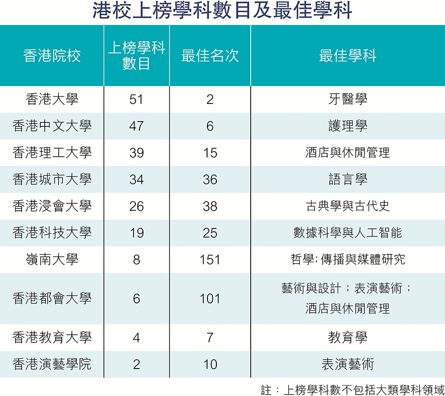 以院校上榜學科數量計,港大共有56個為全港最多,而香港中文大學緊隨其後有52科上榜。雖然今年香港有不少學科名次下跌,但仍有多所大學錄得淨提升,其中嶺南大學與教大進步最為顯著,升幅均達約33%,香港浸會大學亦上升約24%。