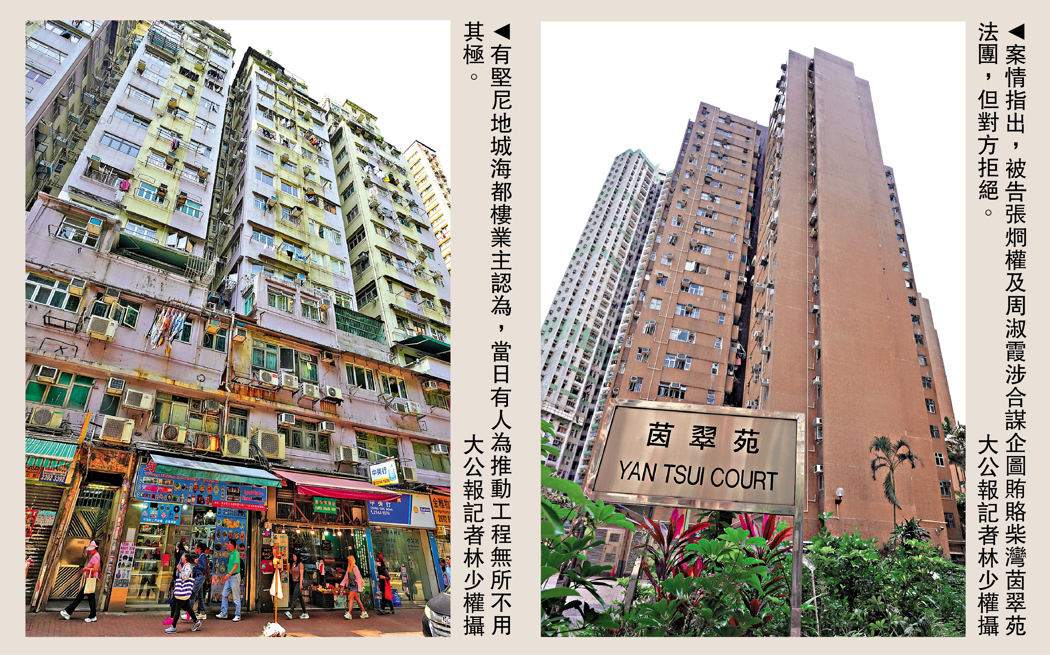 另一宗案件涉及海都樓的大維修工程。廉署指出,當初居民通過決議,將有關工程以3100萬元判予祥利建築,但部分業主入稟土地審裁處要求推翻該決議。兩名「中間人」被告鄭國歡及江寶材涉嫌於2022年10月至2024年2月期間,向一名業主代表提供一封金額不明的「利是」,兩筆合共約60萬元賄款,要求該業主協助游說其他居民庭外和解,但該業主拒絕受賄,亦沒有向二人提供協助,向土地審裁處入稟要求推翻決議的居民,最終獲勝訴。