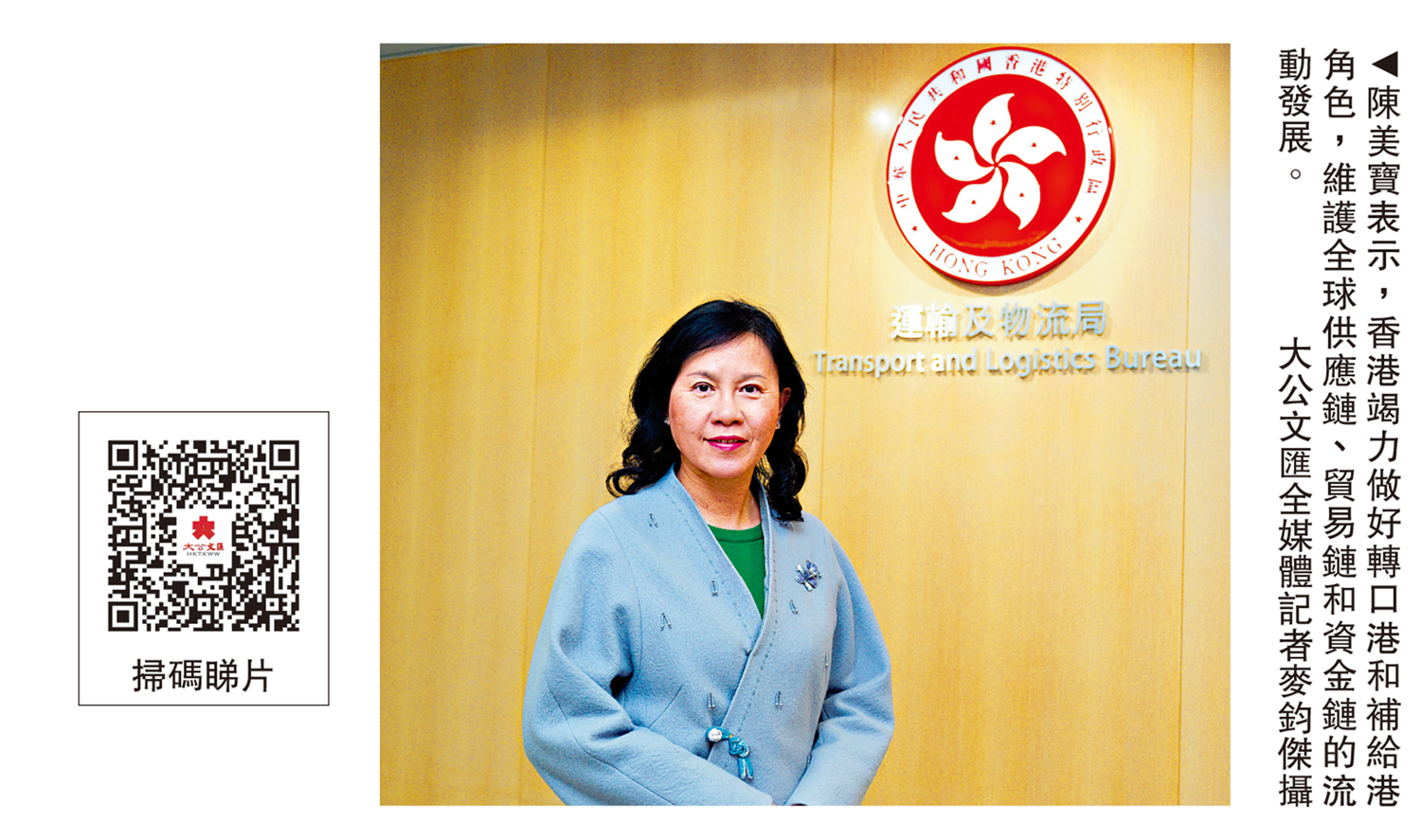 運輸及物流局局長陳美寶接受大公文匯傳媒集團訪問時表示,局方堅定維護國家安全,主動對接國家「十五五」規劃成立專責組,並持續完善風險監測預警體系,鞏固香港運輸及物流的國安屏障。\大公文匯全媒體記者 梁譯尹(文) 福瑞士、葉德榮(視頻)