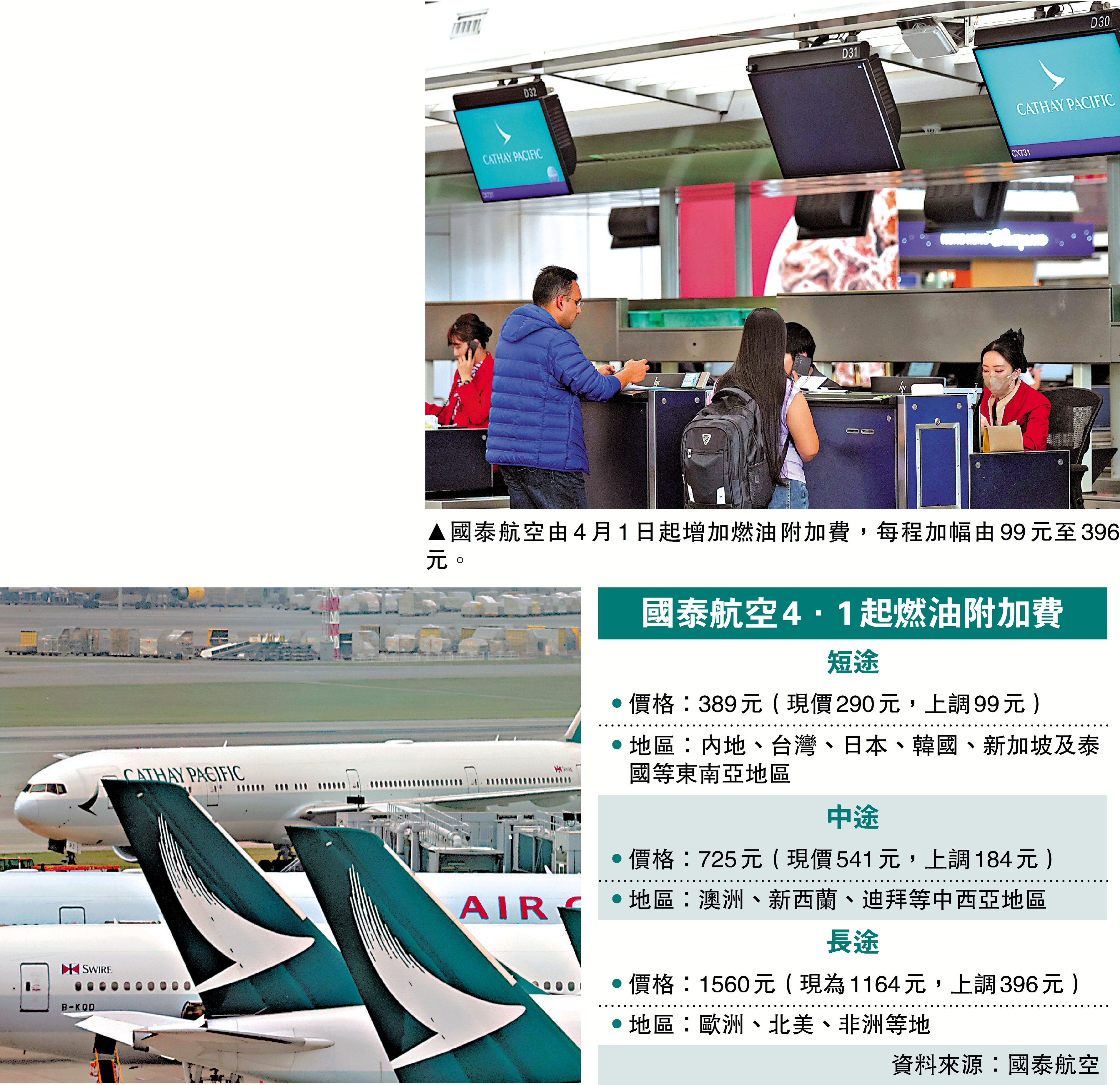 復活節假期乘坐飛機出外旅遊的費用又增加,國泰航空昨日宣布,因應中東局勢持續緊張,航空燃油價格顯著上升,由4月1日起,燃油附加費上調99元至396元不等,是該公司本月內第二次宣布上調燃油附加費。