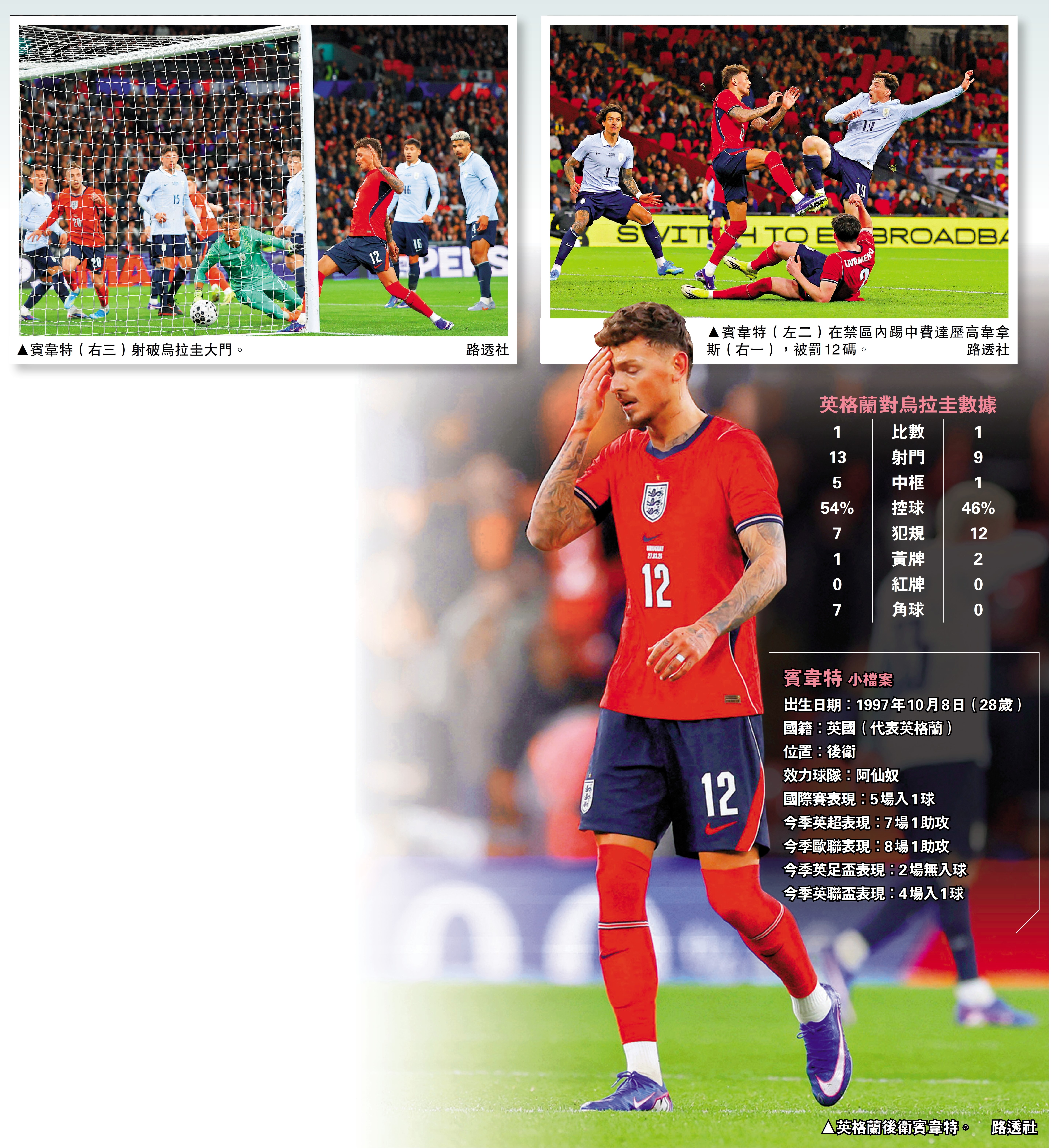 英格蘭28日出戰主場對烏拉圭的國際友誼賽,時隔4年重返代表隊的阿仙奴後衛賓韋特下半場獲後備上陣機會,未料復出一戰即變男主角。賓韋特先在下半場取得個人在代表隊首個入球助英格蘭領先,可惜他在補時階段踢中對手輸極刑,被烏拉圭的費達歷高華維迪操刀12碼破網,雙方1:1完場,使英格蘭連續629分鐘不失球紀錄告終。中堅拍檔哈利馬古尼與主帥杜切爾賽後為他抱不平,認為球迷不應向他報以噓聲。\大公報記者 梁潤森