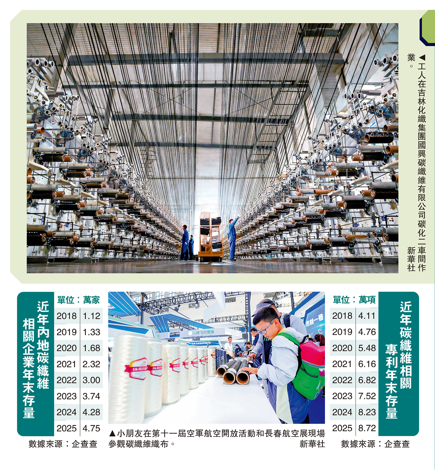 數據顯示,中國碳纖維相關企業存量從2016年的7400多家飆升至2025年的4.75萬家,十年間增長542%。這其中有老牌國企加大科研力度和投入的求變轉型,更多的則是新興企業的加入,成立不足5年的企業佔比超過七成。新生力量拓展了碳纖維材料的應用場景,低空經濟、人形機器人等新興賽道正成為碳纖維企業重點布局的方向。\大公報記者 盧冶、林凱