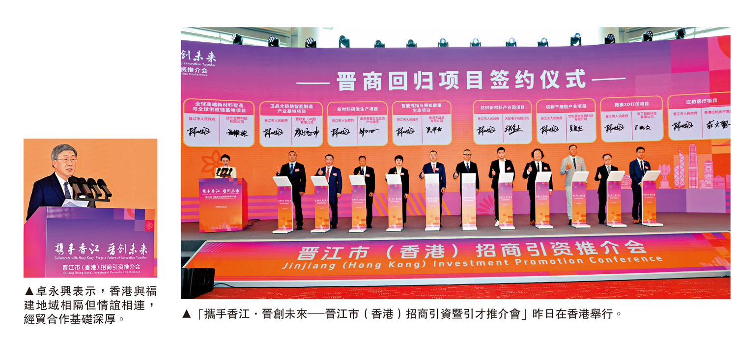 香港與福建經貿合作基礎深厚,「攜手香江·晉創未來─晉江市(香港)招商引資暨引才推介會」昨日在香港舉行。是次推介會簽約21個項目,涵蓋新一代信息技術、生命健康產業、新材料(未來產業)、現代服務業等領域,涉資670億元。政務司副司長卓永興出席致辭時表示,今次推介會見證閩港兩地的交流合作展開新篇。\大公文匯全媒體記者 孫曉旭