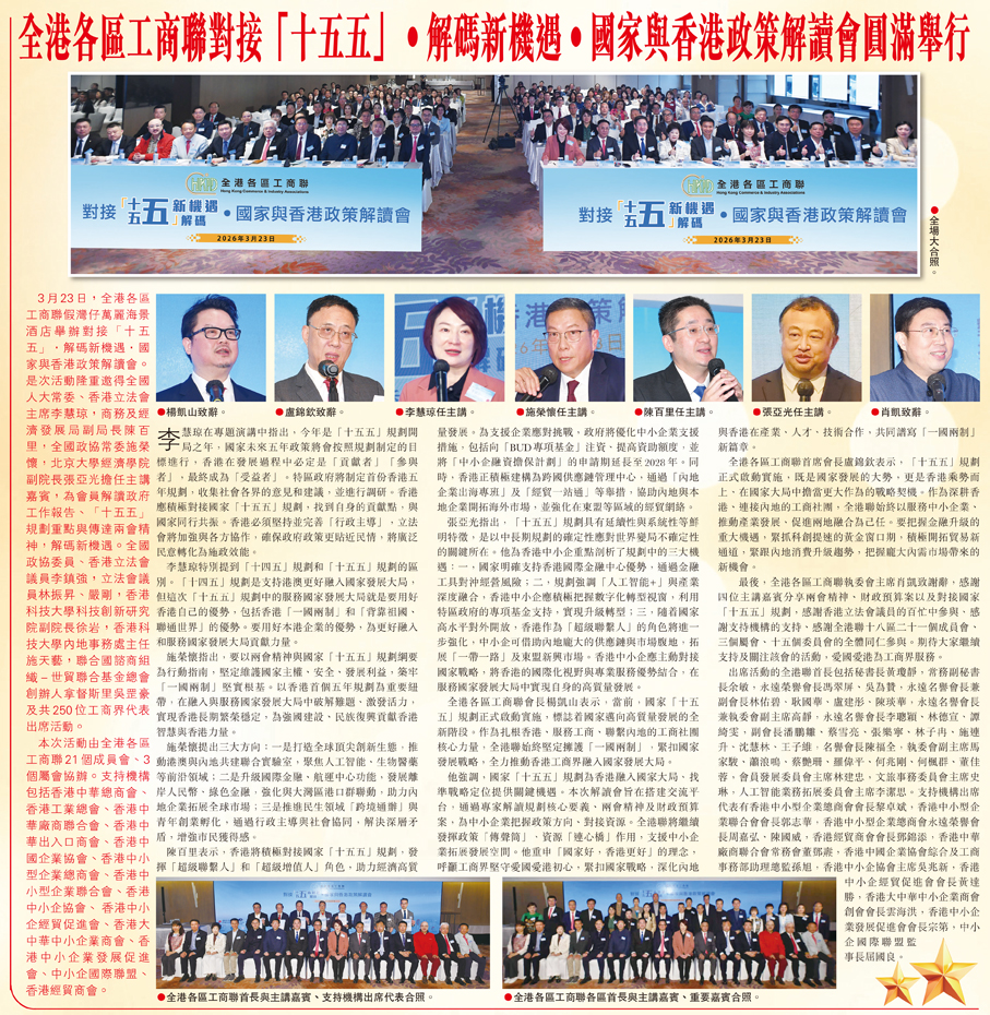 3月23日,全港各區工商聯假灣仔萬麗海景酒店舉辦對接「十五五」·解碼新機遇·國家與香港政策解讀會。是次活動隆重邀得全國人大常委、香港立法會主席李慧琼,商務及經濟發展局副局長陳百里,全國政協常委施榮懷,北京大學經濟學院副院長張亞光擔任主講嘉賓,為會員解讀政府工作報告、「十五五」規劃重點與傳達兩會精神,解碼新機遇。全國政協委員、香港立法會議員李鎮強,立法會議員林振昇、嚴剛,香港科技大學科技創新研究院副院長徐岩,香港科技大學內地事務處主任施天藝,聯合國諮商組織-世貿聯合基金總會創辦人拿督斯里吳罡豪及共250位工商界代表出席活動。