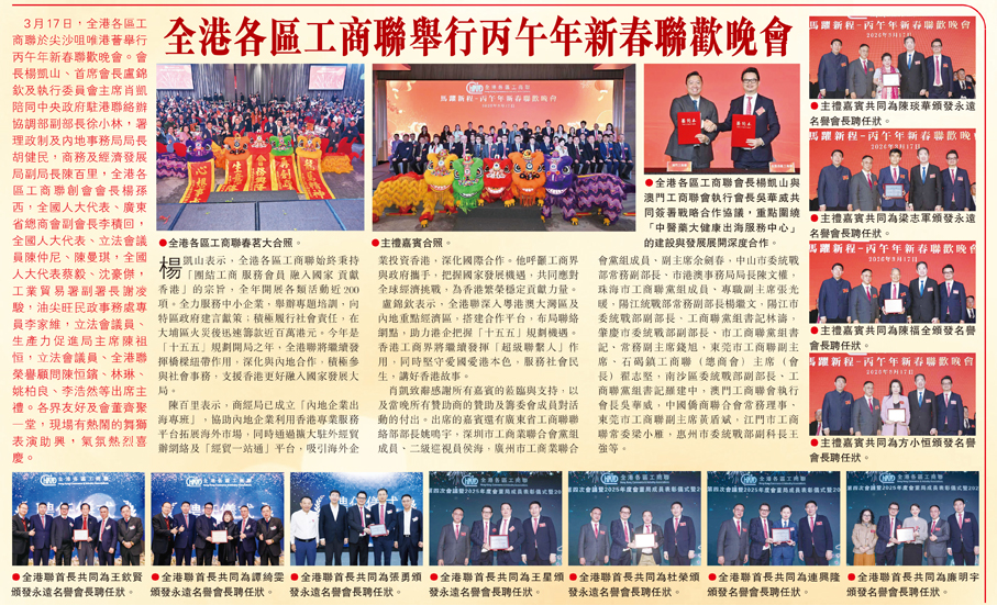 3月17日,全港各區工商聯於尖沙咀唯港薈舉行丙午年新春聯歡晚會。會長楊凱山、首席會長盧錦欽及執行委員會主席肖凱陪同中央政府駐港聯絡辦協調部副部長徐小林,署理政制及內地事務局局長胡健民,商務及經濟發展局副局長陳百里,全港各區工商聯創會會長楊孫西,全國人大代表、廣東省總商會副會長李積回,全國人大代表、立法會議員陳仲尼、陳曼琪,全國人大代表蔡毅、沈豪傑,工業貿易署副署長謝凌駿,油尖旺民政事務處專員李家維,立法會議員、生產力促進局主席陳祖恒,立法會議員、全港聯榮譽顧問陳恒鑌、林琳、姚柏良、李浩然等出席主禮。各界友好及會董齊聚一堂,現場有熱鬧的舞獅表演助興,氣氛熱烈喜慶。