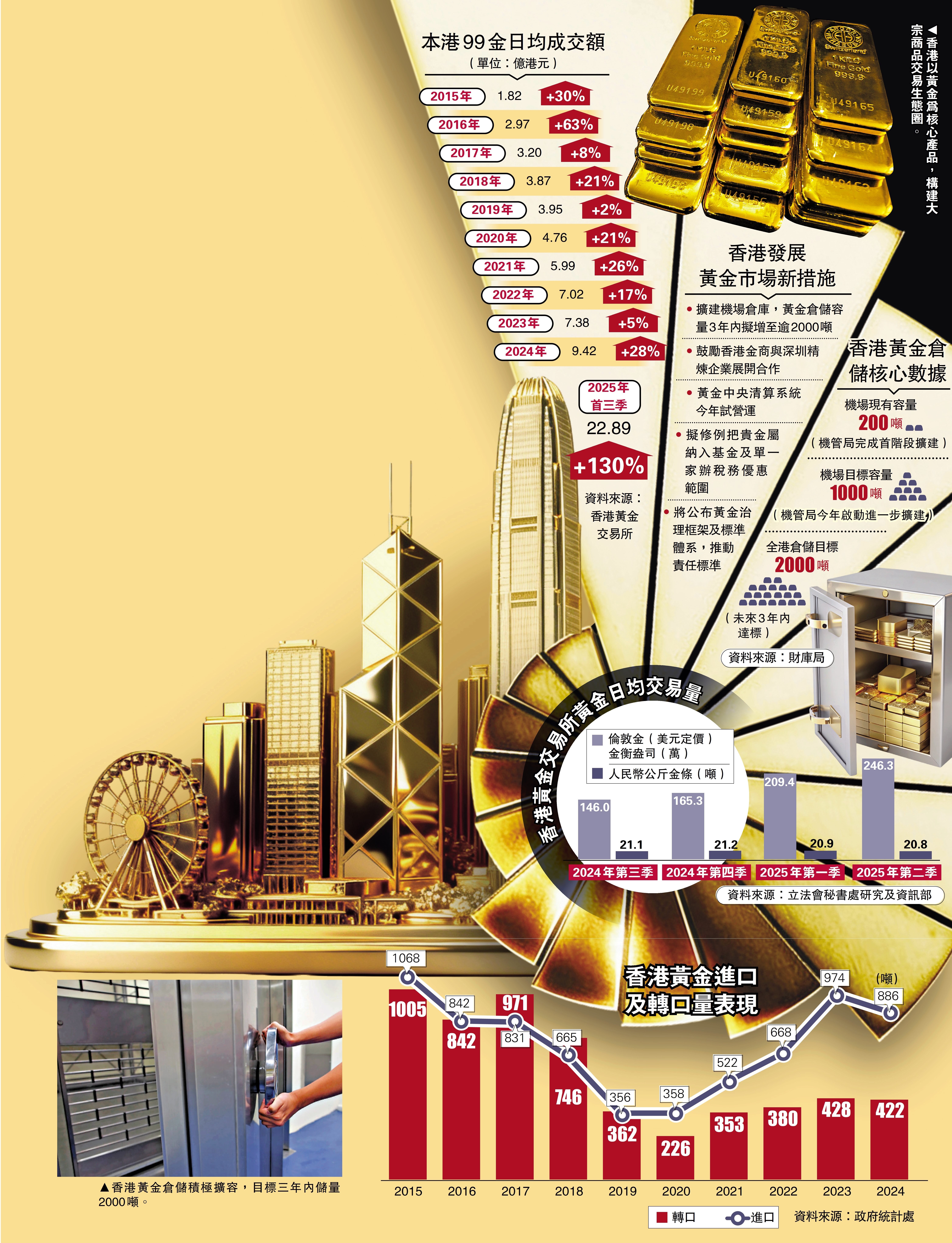 特區政府早在2024年施政報告提出,以黃金為核心產品,推動香港建立大宗商品交易生態圈;2025年施政報告進一步明確,推動香港機場管理局及金融機構擴充黃金倉儲容量,力爭3年內儲量突破2000噸,將香港打造成全球信賴的黃金儲備樞紐。