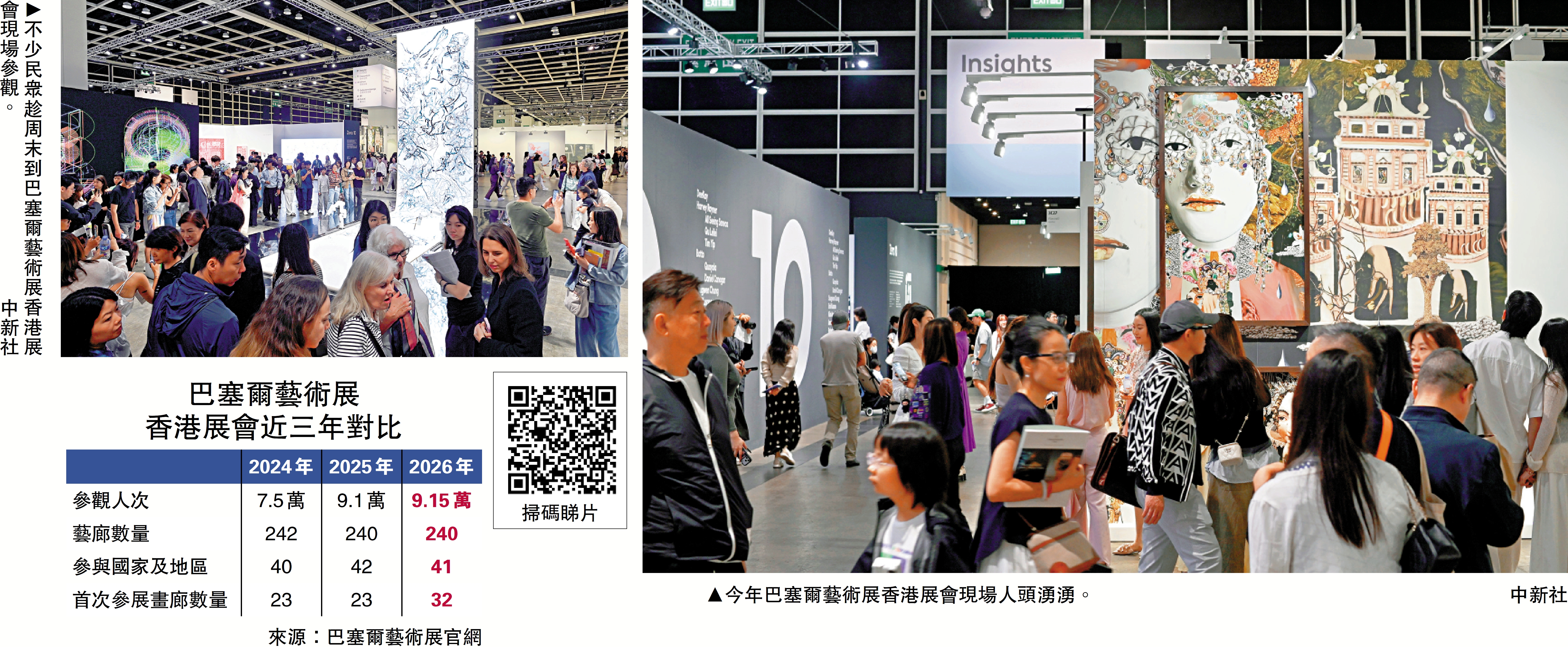 2026年巴塞爾藝術展香港展會昨日落幕。今年展會匯集來自41個國家及地區的240間藝廊,於貴賓預展及公眾開放日,一連五天共計吸引約91500名訪客到場,現場交易氣氛活躍,各類畫廊及藝術機構均錄得穩健銷售。亦有國際畫廊表示,香港是理想的文化交流平台,為藝術交流提供便利。展會開幕首日,香港特區政府文化體育及旅遊局亦宣布與巴塞爾藝術展敲定協議,確定未來5年香港是亞洲區內唯一展會場地,進一步鞏固香港作為亞洲區內重要國際藝術樞紐的地位,並推動本地文化生態的長遠發展。\大公報記者 郭悅盈、徐小惠