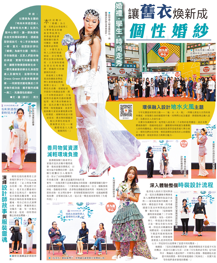 早前,以環保為主題的「時尚未來造型達人暨模特兒大賽」在西九龍中心舉行,讓一群熱愛時尚並支持環保的學生,透過造型穿搭技巧,令二手衣物煥然一新。當天,造型設計師以「婚禮」為創作主題,利用二手衣物再造,反思人們對衣物的承諾,實踐可持續發展理念,讓舊衣物煥發嶄新生命。一群充滿創意的學生化身造型達人及模特兒,並聯同來自 Dress Green 的退休裁縫師傅,一同將惜衣館收集的二手衣物升級改造,親手製作成獨一無二、充滿個性的婚紗。