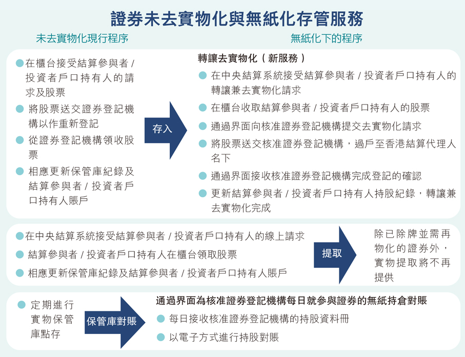 根據證監會的計劃,無紙證券市場實施後,新上市的證券將須自上市時起以無紙形式發行。至於實施日期前已經上市的證券,發行人將於5年內逐步納入無紙證券市場制度。