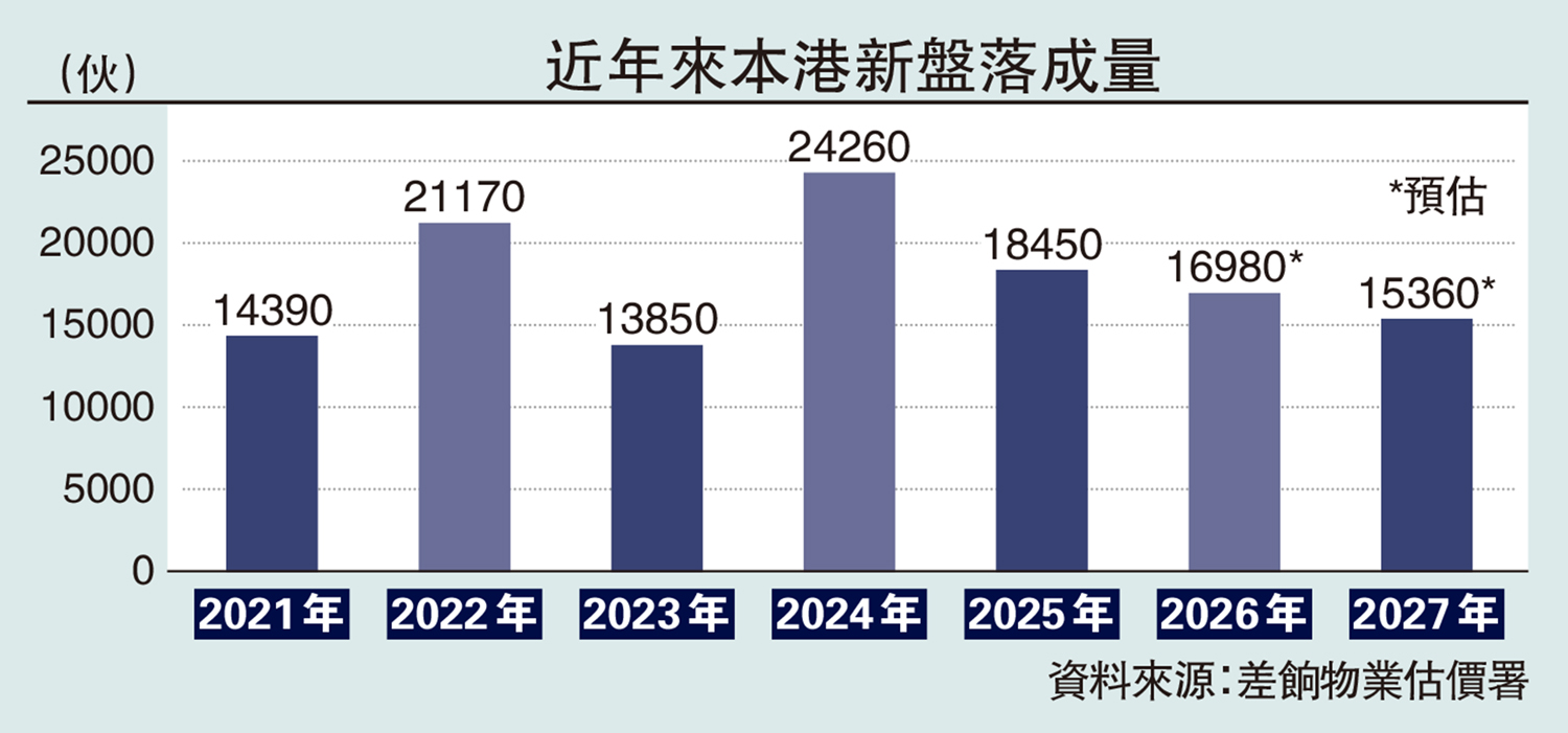 最新差餉物業估價署公布《香港物業報告2026》初步統計數字,整體新盤落成量自去年開始接連下跌,去年落成量只有1.845萬伙,較2024年的2.426萬伙大幅回落24%,而今年的落成量亦將會回落至1.698萬伙,按年下跌8%,預計來年落成量會進一步減至1.536萬伙,按年跌幅亦接近10%。