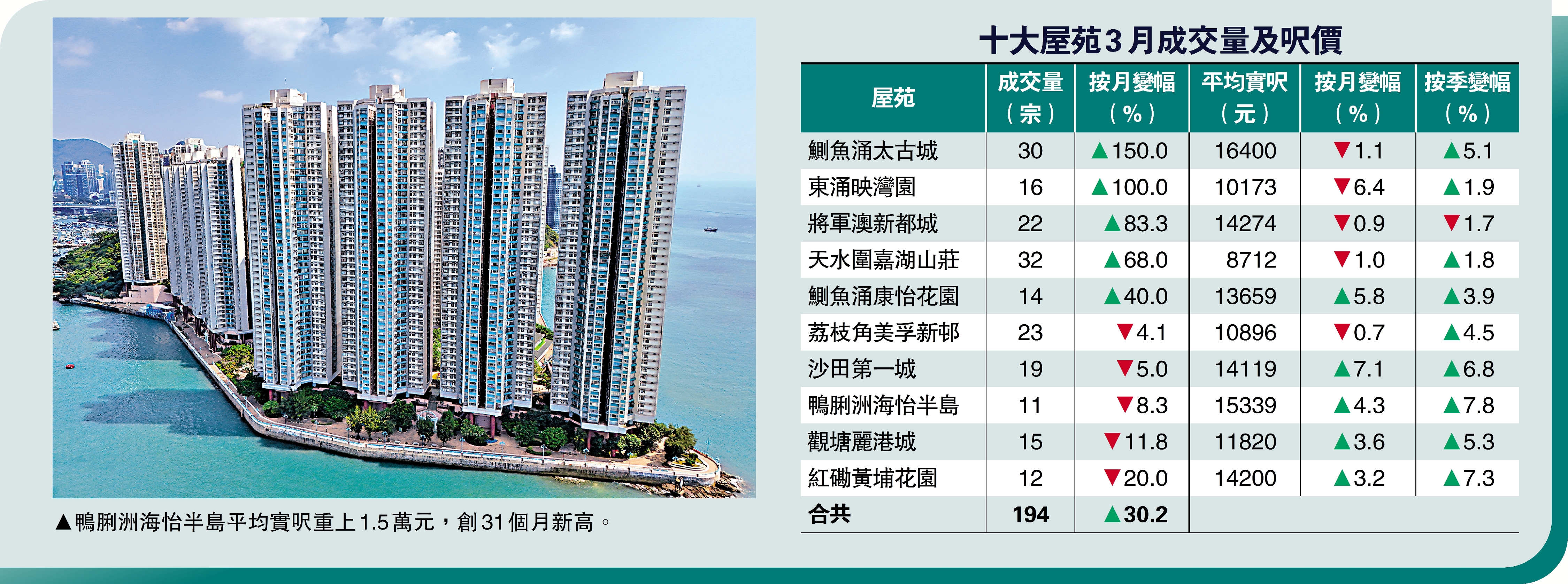 價量齊升/十大屋苑成交194宗 按月彈三成