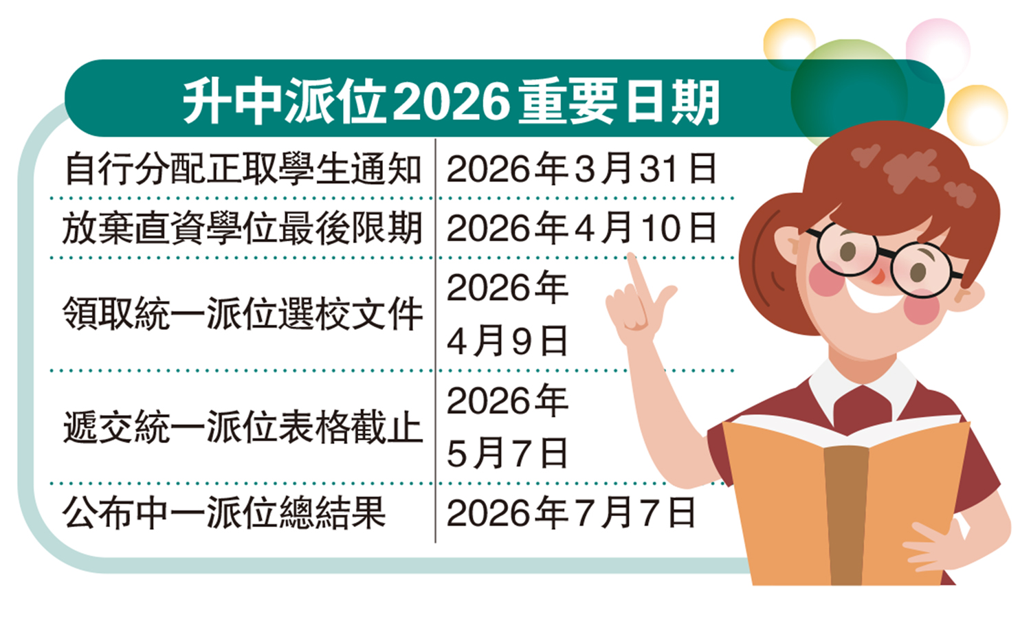 【大公報訊】記者郭如佳報道:又到升中自行分配學位的大日子。教育局昨日公布,參加應屆(2026年度)中學學位分配辦法(中一派位)的小六學生家長,如子女已申請參加中一自行分配學位並獲甄選為正取學生,家長今天將接獲有關中學通知,而未獲通知為正取的學生,則可參加統一派位。簡而言之,學生如果幸運獲得心儀學校取錄,就可以準備迎接中學生活;若不幸落選,就要積極部署7月份的中一統一派位,並作好中一叩門的準備。