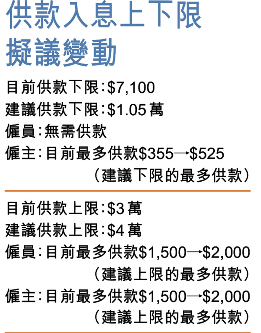 消息指,強積金供款入息的上下限或將分別提高至4萬元及1.05萬元。即日後收入低於1.05萬元的僱員無須供款強積金,僱主則繼續供款,金額是僱員月薪的5%;至於上限由3萬元增至4萬元,即勞資雙方每月供款上限將由現時1,500元增至2,000元,即每月多供500元。據了解,局方對勞顧會建議的調整幅度持開放態度,會繼續收集意見。