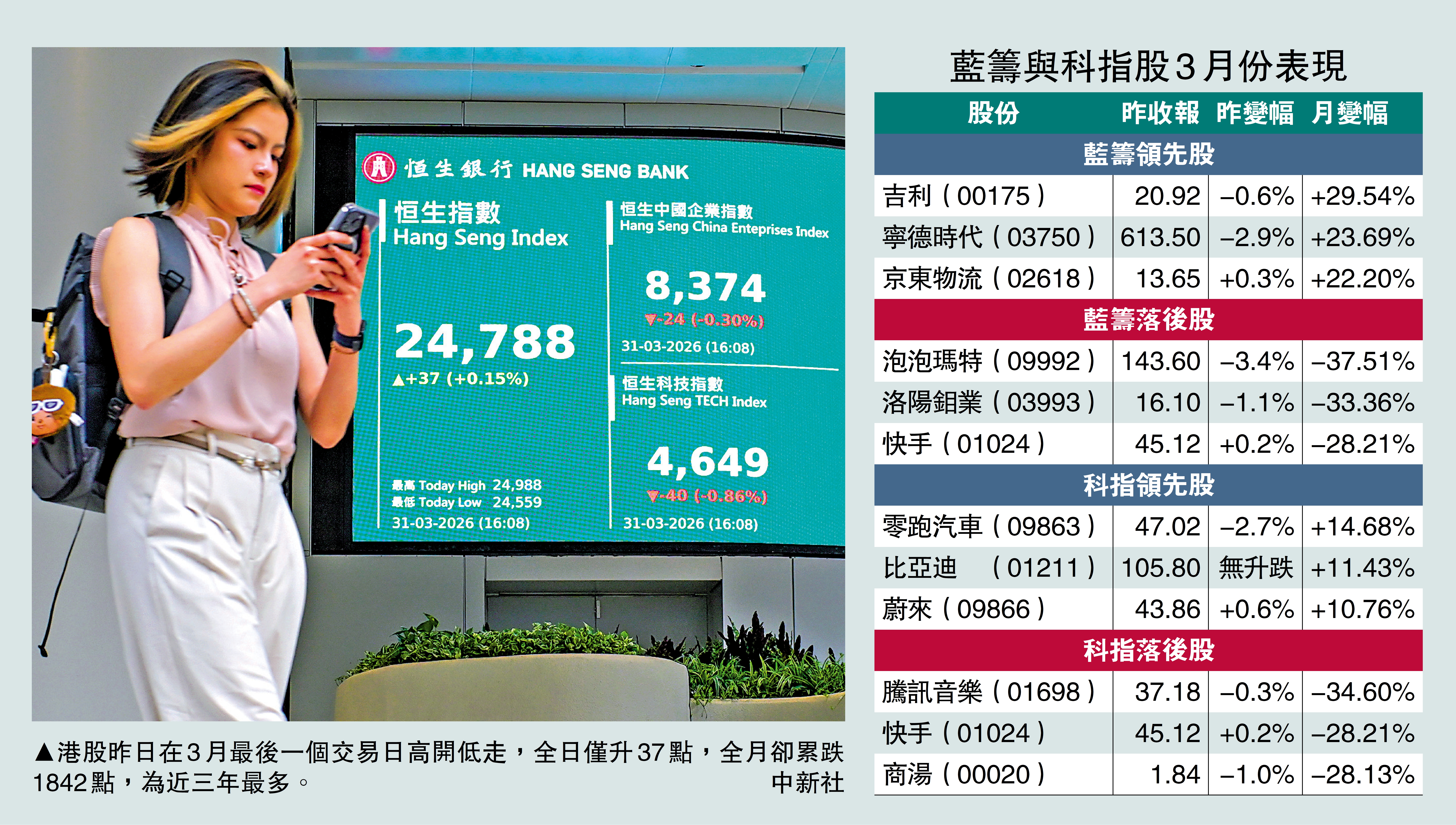美以對伊朗發動軍事打擊已滿一月,拖累全球股市大跌,亞洲尤烈。港股昨日在3月最後一個交易日高開低走,全日收報24788點,升37點,全月累跌1842點,為近三年最多;3月累計跌幅6.9%,為近二年最傷。專家表示,現時不宜再預測恒指關鍵位支持,應聚焦防守性較強的股份,如內銀、內地公路股及電訊股。有券商認為,大市可能逐漸見底,若地緣局勢出現轉機,恒指將會有明顯升勢。\大公報記者 麥晉瑋