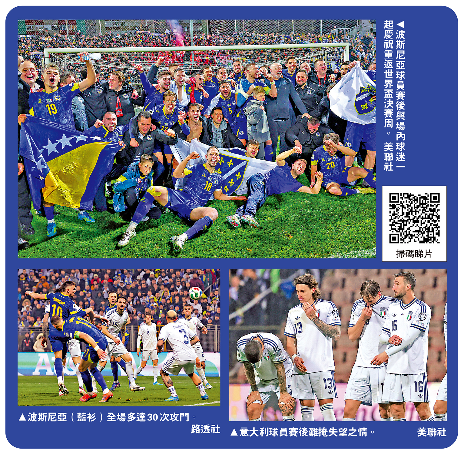 2026年世界盃決賽周48隊終於全部誕生,昨晨上演多場歐洲區及洲際區外圍賽附加賽決賽,決出最後6個席位。當中,有人歡喜有人愁,有闊別多年重返決賽周的,亦有傳統強隊爆冷出局,後者主角正是4屆世界盃冠軍意大利。意大利於歐洲區附加賽A線路決賽造訪波斯尼亞法定時間賽和1:1,最後在互射12碼落敗出局。意大利自2014年巴西世盃分組賽出局後,今次失敗宣告連續3屆止步附加賽,無緣決賽周。\大公報記者 譚德龍