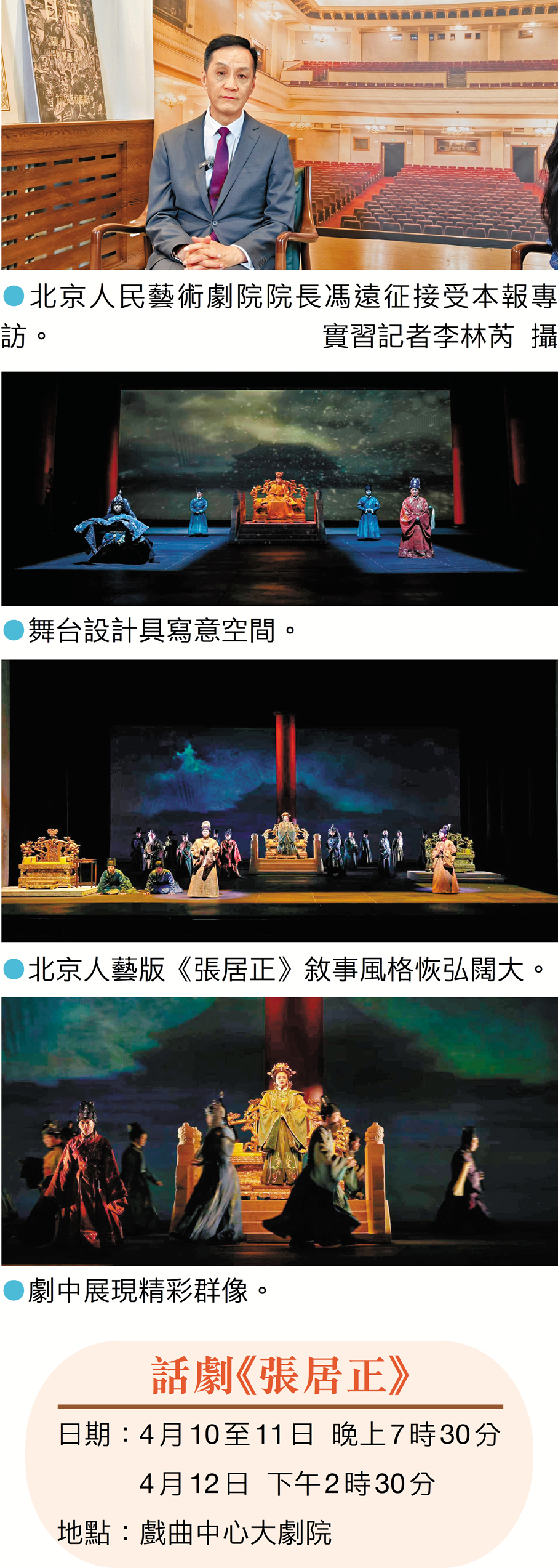 談及此次赴港演出,馮遠征直言非常期待。「之前人藝的《茶館》《古玩》都曾去過香港,並受到當地觀眾的熱烈歡迎。我相信,與內地同根同源的香港同胞一定會非常喜歡《張居正》這部話劇。」馮遠征特別提到,這次赴港,整個演出不會做任何調整,確保將最原汁原味的人藝作品呈現在香港觀眾面前。