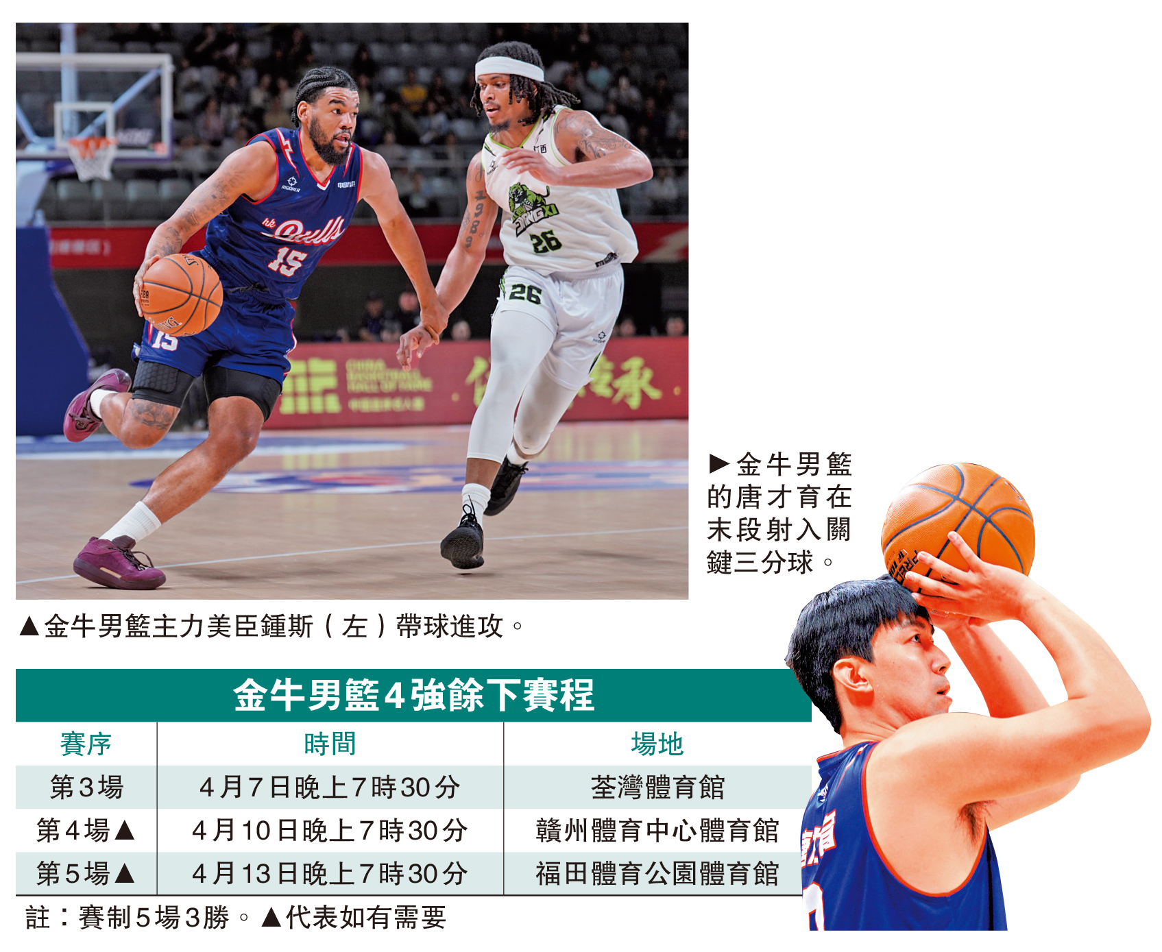 易邊再戰,金牛輕微調整陣容,開賽即打出6:0的小高潮將比分反超。隨後雙方拚搶激烈,末段,金牛體能有所下降,對手再度取得領先,3節結束金牛以66:71落後。最後一節,鍾斯連續得分扳平比分,關鍵時刻,唐才育射入三分球,最終金牛以4分之微勝出。