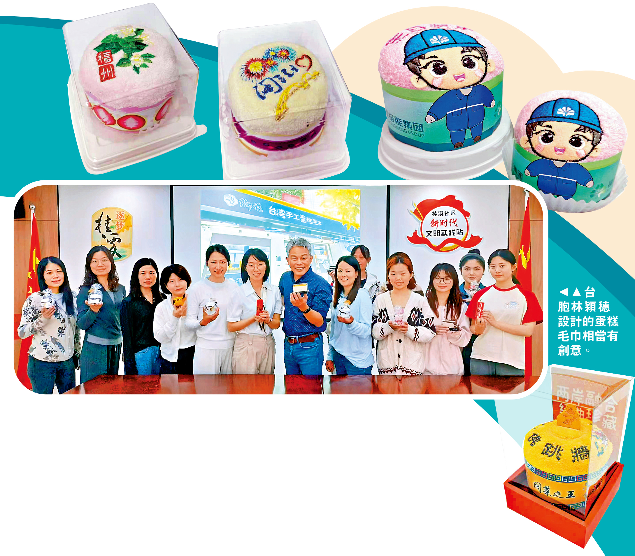 精緻圓形底座、細膩奶油裱花造型,頂層綴以仿真鮮果,外觀香甜逼真、幾可亂真─這款備受市場歡迎的蛋糕毛巾,是台灣同胞林穎穗扎根大陸打造的文創爆款之一。出身台灣毛巾世家的他,看準大陸廣闊市場與惠台政策機遇,近年正式落地福州創業。林穎穗向《大公報》表示,大陸的市場規模與發展潛力是台灣難以比擬的,這也是他堅定選擇來福州發展的關鍵原因。他亦坦言,創業路上遇到不少挑戰,但在惠台政策的支持下,自己正一步步融入當地、穩步向前。\大公報記者 蘇榕蓉福州報道(文、圖)