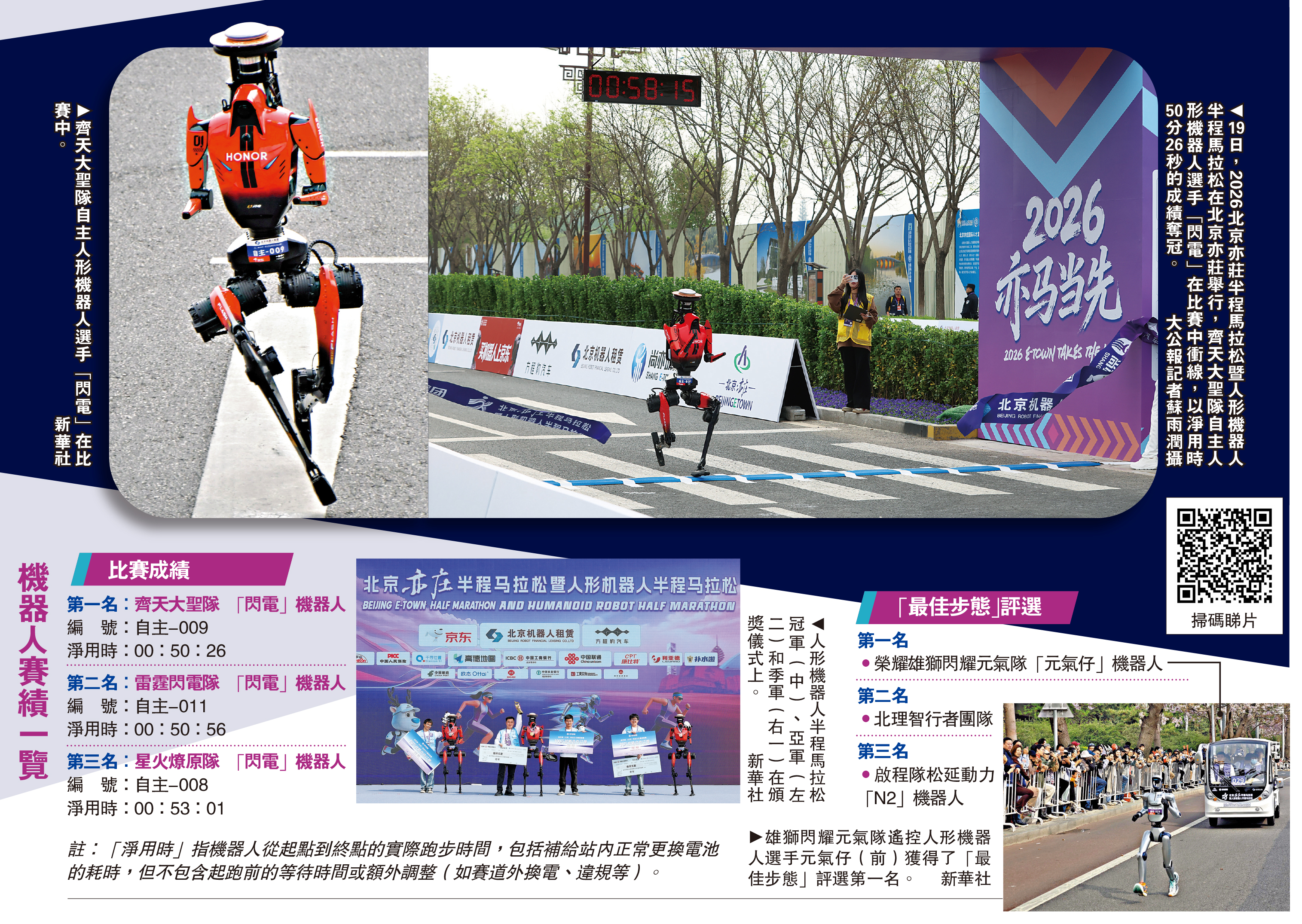 19日,全球首個人形機器人馬拉松品牌賽事—2026北京亦莊半程馬拉松暨人形機器人半程馬拉松在北京經濟技術開發區鳴槍開跑,超百支人形機器人賽隊與1.2萬人共同參賽。早上7時30分,人形機器人和跑者在起點同時鳴槍起跑,經過激烈角逐,齊天大聖隊、雷霆閃電隊、星火燎原隊分別奪得冠軍、亞軍、季軍,淨用時分別為50分26秒、50分56秒、53分01秒,三支戰隊的參賽機器人均為自主導航機器人,奪冠的齊天大聖隊「閃電」機器人還一舉打破人類半程馬拉松紀錄,快男子半馬世界紀錄近7分鐘。\大公報記者 馬曉芳、郭瀚林、蘇雨潤