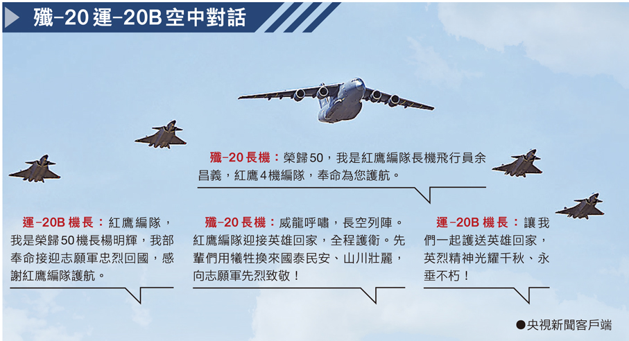 第十三批在韓中國人民志願軍烈士遺骸22日上午由中國空軍運-20B運載、4架殲-20護航,抵達遼寧瀋陽。接近中午12點,晴空萬里,載有12位志願軍烈士遺骸及146件遺物的運-20B緩緩降落在瀋陽桃仙國際機場,機場以「過水門」最高禮遇為英靈洗塵。現場,1,800位來自社會各界的代表佇立凝望,迎接英雄回家。12位港澳師生代表列隊其中,轟鳴的軍機交織着低回的《思念曲》,當覆蓋着五星紅旗的棺槨被禮兵緩緩捧出機艙,學生們的心緒沉重而震撼,久久不能平靜,「彷彿能看到一個個鮮活的生命,更清楚地感受到這份重量。」當運-20B運輸機和四架伴飛護航的殲-20編隊抵達旅順軍港上空時,鄂爾多斯艦高懸滿旗,首次與專機進行空海對話,以「空海聯動」的全新禮遇,迎接英烈歸來。