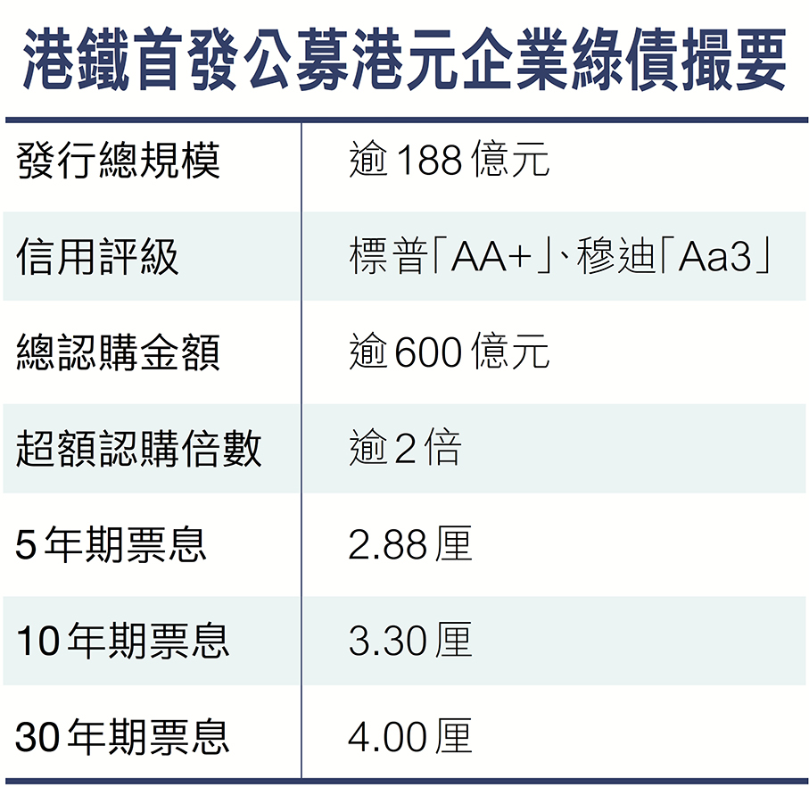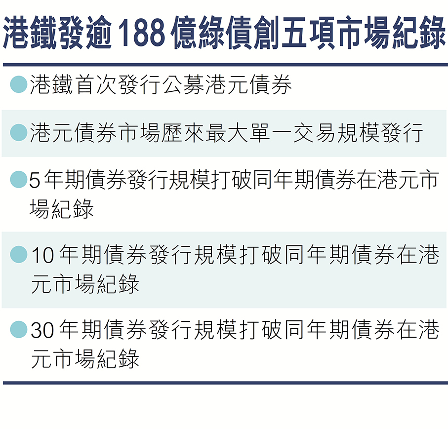 港鐵發逾188億綠債 創五項紀錄 主權財富基金等熱烈認購 港元公募債市場續升溫
