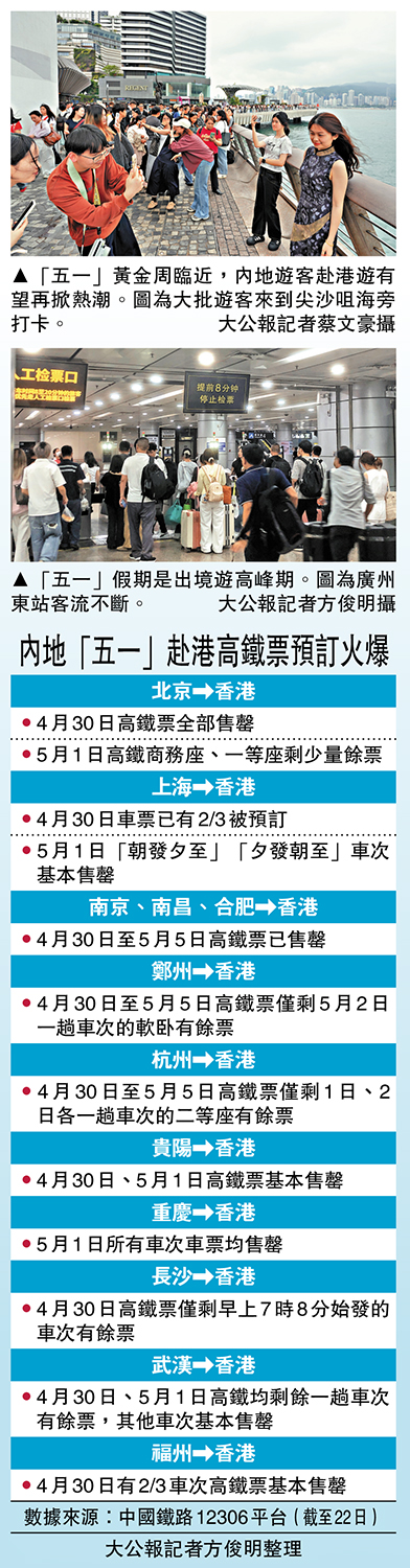 內地「五一」黃金周假期臨近,受中東局勢影響,航空燃油價格上漲,內地部分出國航班加價或取消,不少原本計劃「出國遊」的內地客改選搭乘高鐵赴港遊。記者22日上午在中國鐵路12306平台查詢獲悉,內地城市「五一」赴港高鐵票預訂火熱,部分城市赴港熱門時段高鐵票已告罄。珠海市旅行社行業協會相關負責人表示,港澳地區今年「五一」期間推出了豐富多樣的攬客活動,預計假期港澳遊的客源將有所增長,乘高鐵遊香江將頗受歡迎。有旅客坦言,「五一」假期不出國而選擇赴港遊「同樣精彩」。\大公報記者 方俊明