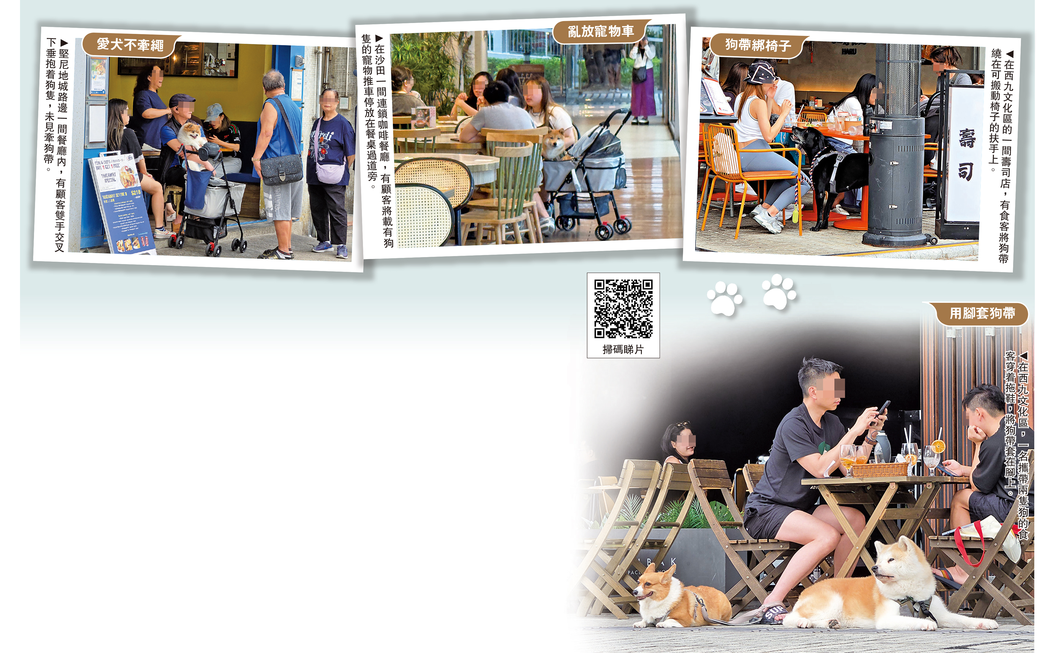 《2026年食物業(修訂)規例》要求狗隻在食肆時,須時刻以長度不超逾1.5米的狗帶,被成人穩妥地牽引或被穩妥地縛在固定附着物上。記者發現,上述狗主人的攜犬方式,皆存在可能不符合下月新規的行為。