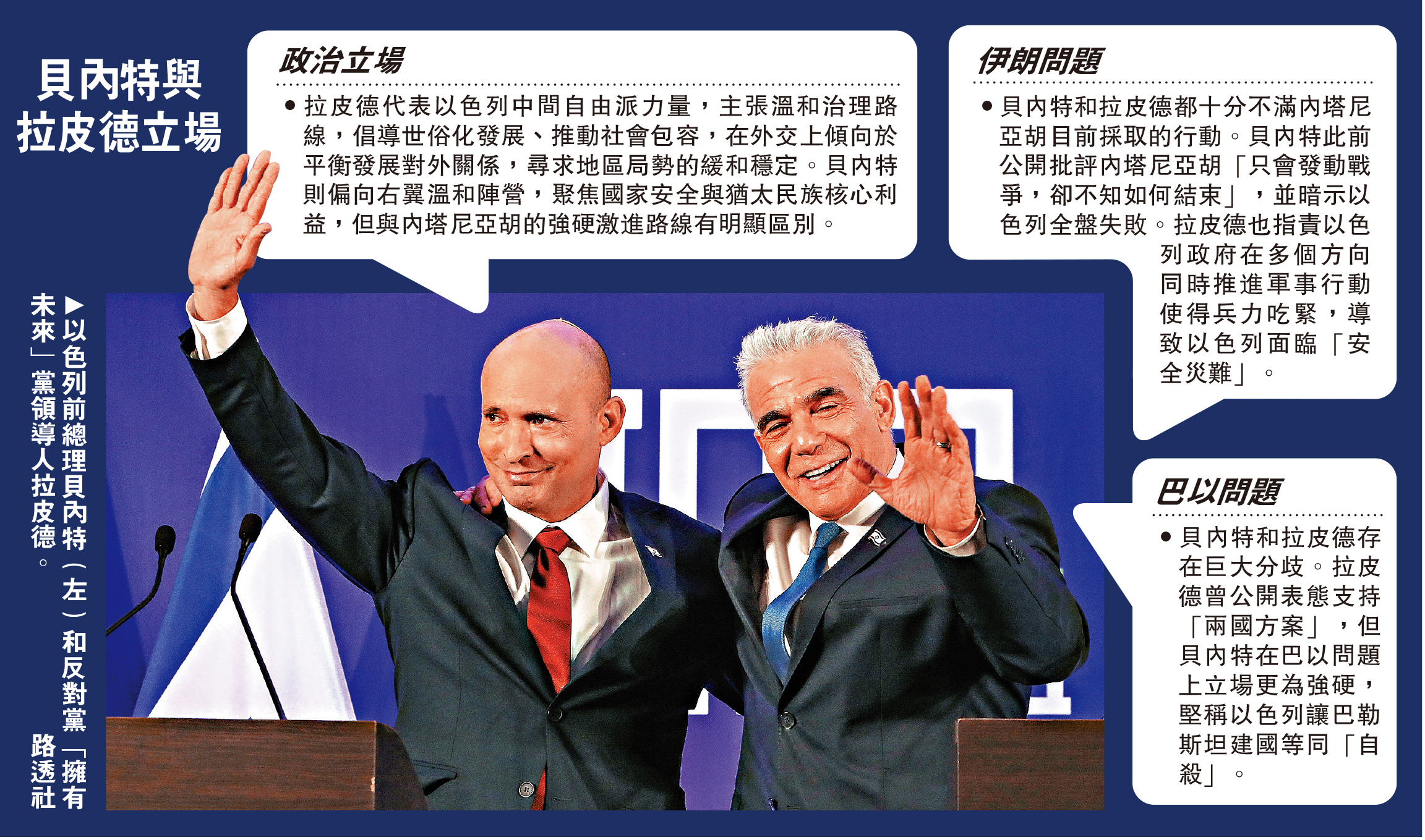 2021年大選中,貝內特與拉皮德聯手擊敗連續執政12年的內塔尼亞胡,組建聯合政府,但在巴以等重大議題上陷入嚴重分歧,只維持了18個月。