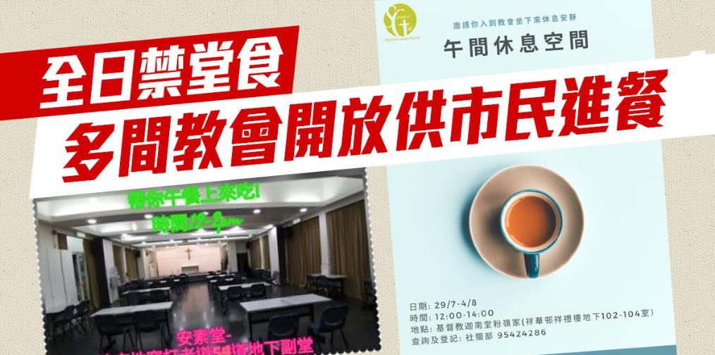 位於長沙灣道的中國基督教播道會恩福堂,即日起至8月4日每天上午11時至下午3時將會開放午謄空間,以「一人一枱」用餐。