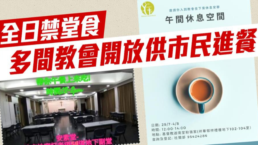 據大公文匯全媒體報道,本港新冠肺炎疫情嚴峻,政府今日(29日)起加強防疫措施,食肆全日禁止堂食,只准外賣。不少上班一族及工友在炎熱天氣下,不得不在路邊、公園仔進食,衞生環境堪憂。多間教會今日在社交平台發文指,教堂開放予市民入內進餐。