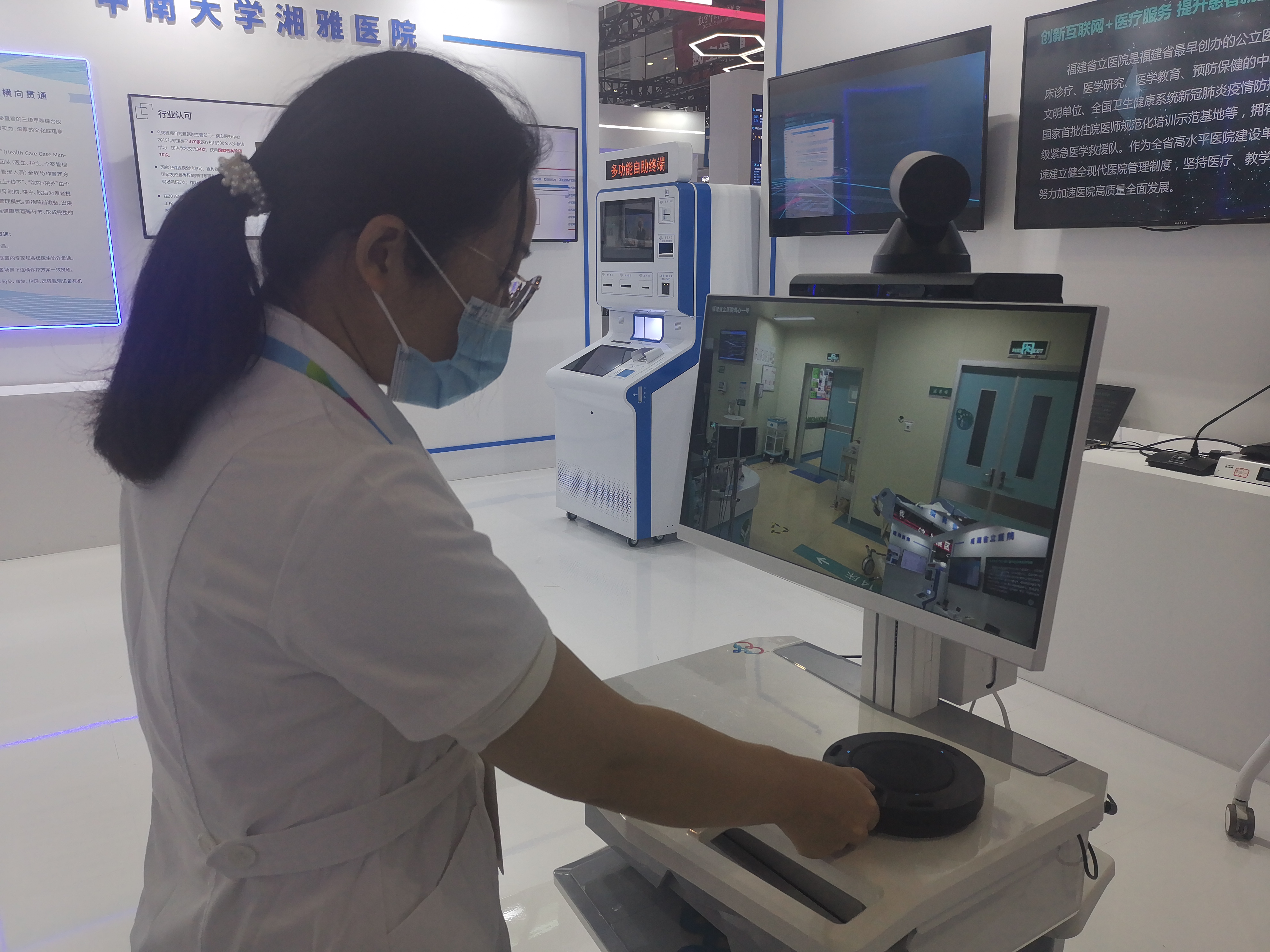 在展會的8號館,數字抗疫板塊展示了新冠肺炎疫情發生以來,各地各部門以大數據、人工智能、雲計算等數字技術為驅動開展疫情防控、醫療救治、復工復產的典型案例,涉及優秀技術產品、解決方案、實踐案例等方面。在福建省立醫院展區,福建新冠肺炎防治遠程指導中心格外引人註目,現場還有一台與該院重症監護室實時連線的5G高清移動診療車。該醫院工作人員尚秀玲向本網記者介紹,福建省立醫院的5G移動診療車在今年疫情期間投入使用,主要用在重症病房,功能包括查房、多學科會診以及無接觸探視三個方面,「除能直接和省立醫院的專家5g聯網會診外,今年疫情期間我們就讓ICU病房的病人和外面家屬進行視頻通話探視,非常便捷。|」