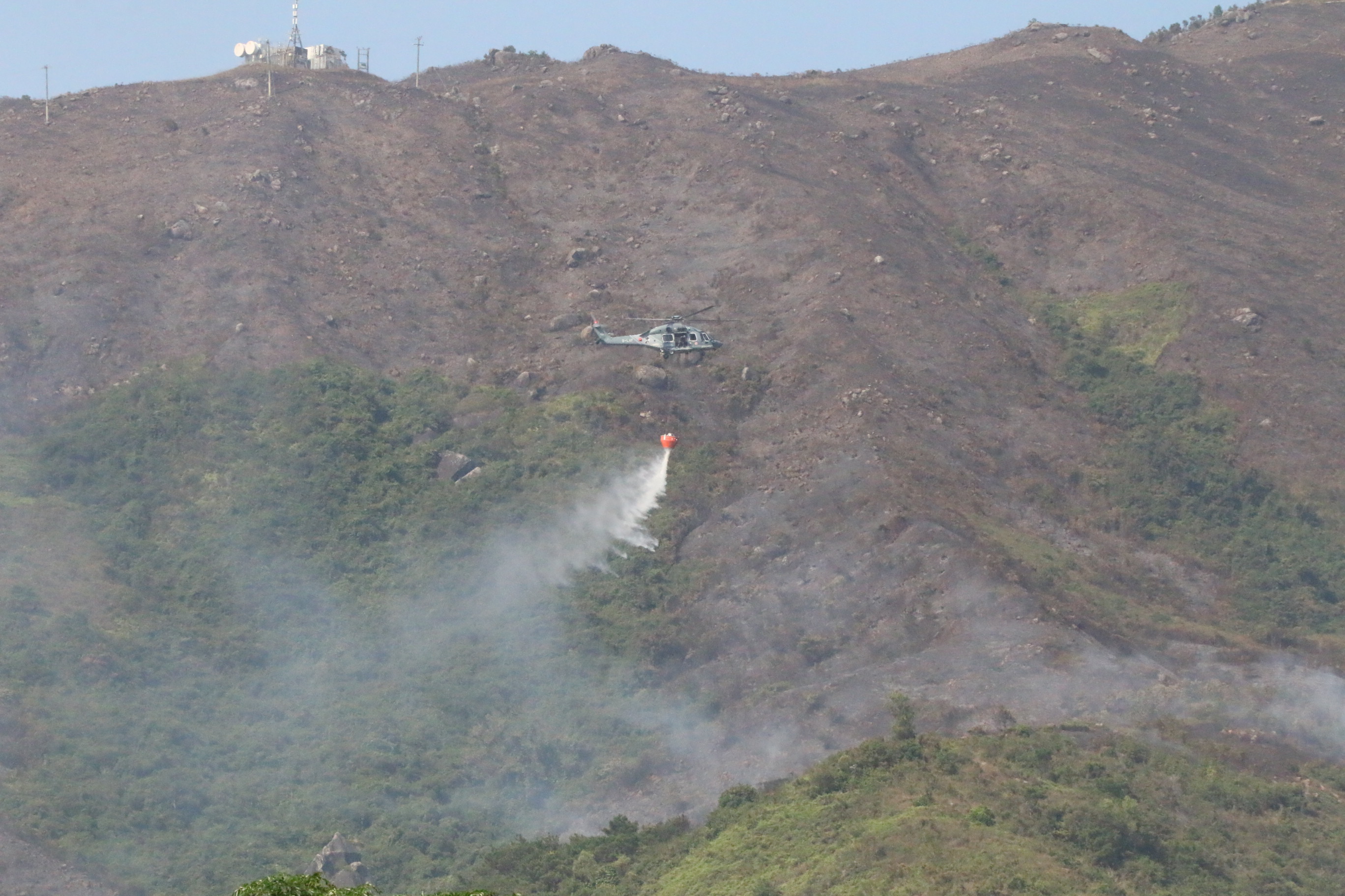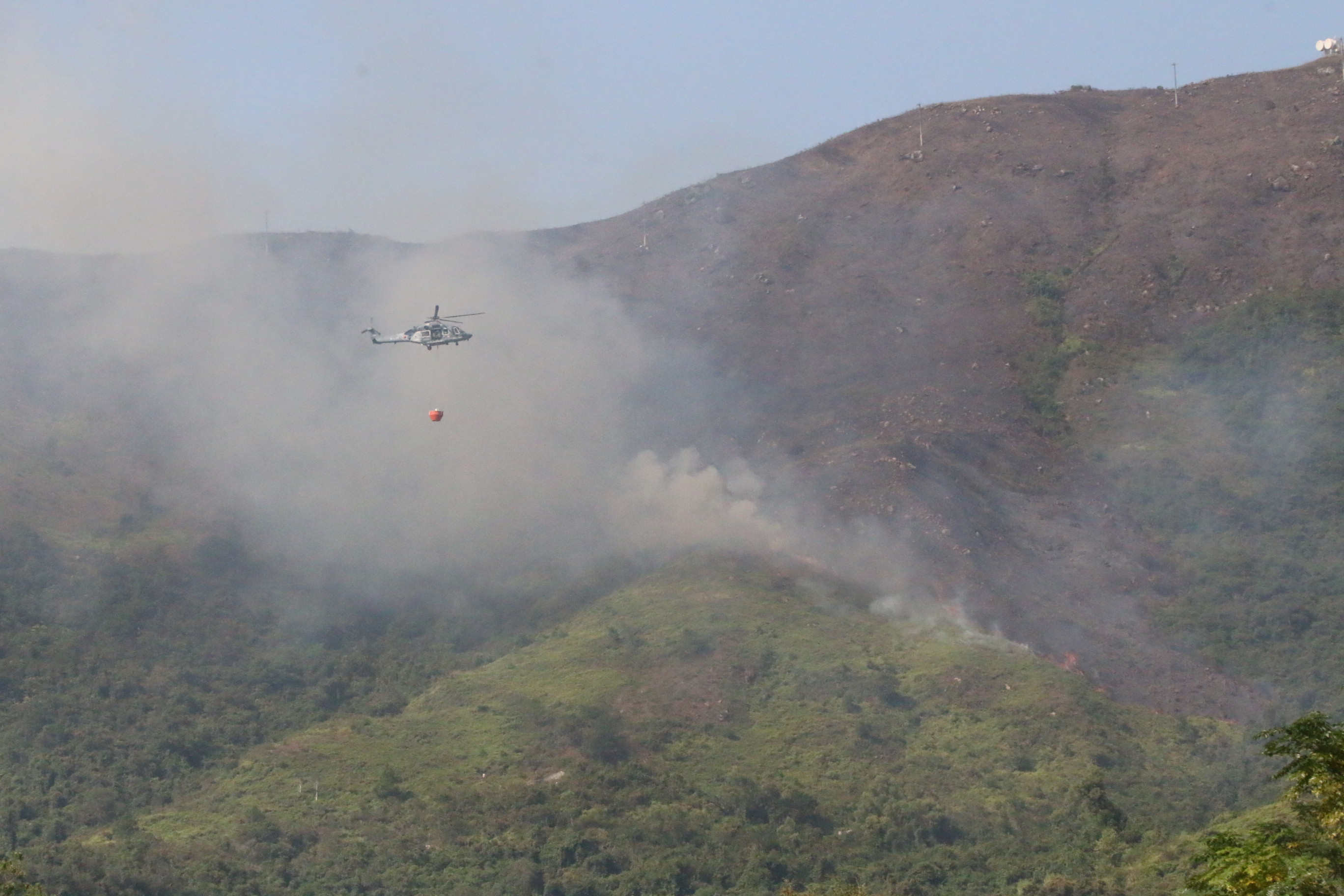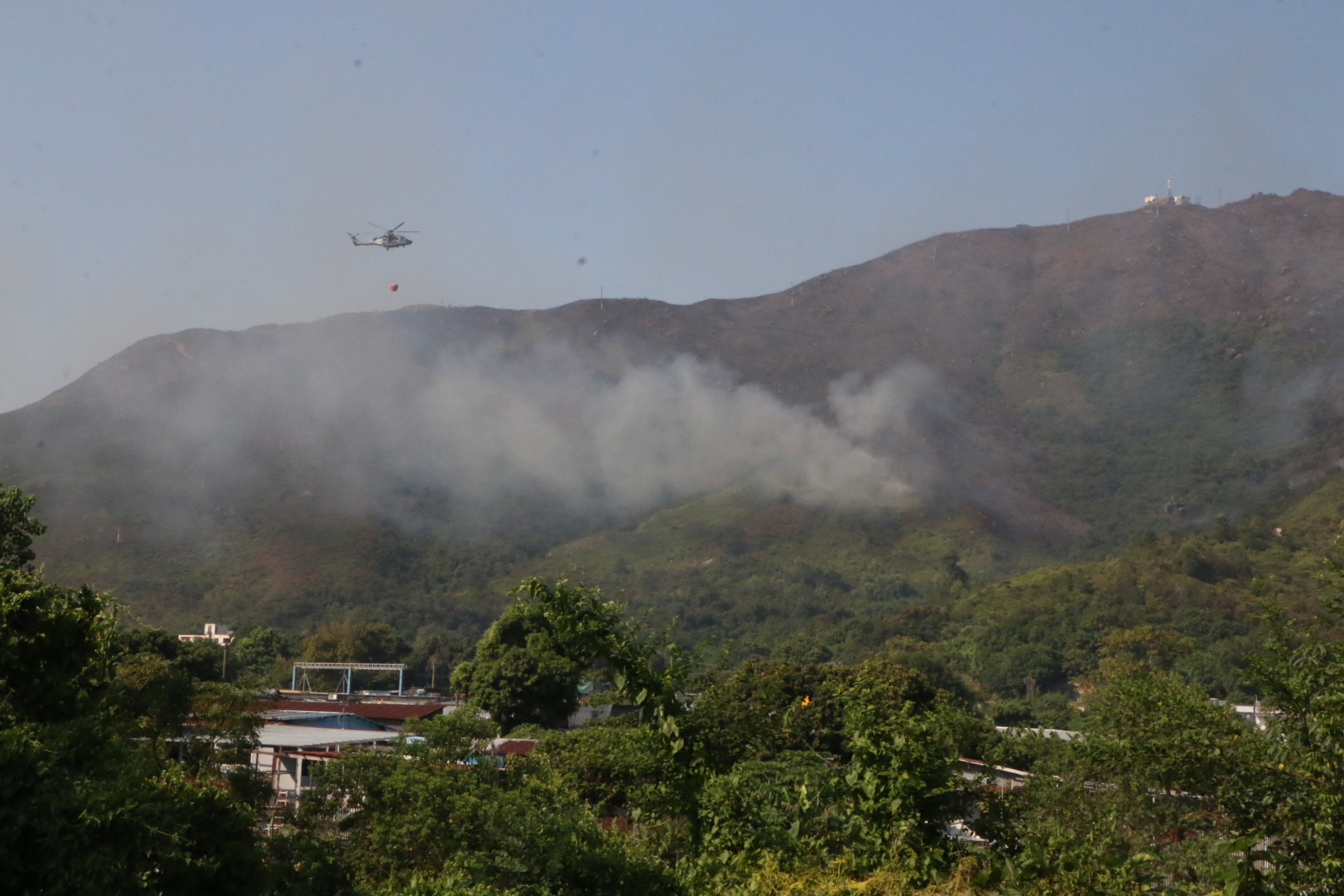 八鄉大江埔對上雞公嶺發生山火。大火自前日下午開始蔓延,至今(26日)已燃燒逾40小時,部分山頭仍見火光,消防員多次出動登山撲救。政府飛行服務隊直升機在今午近1時再次出動,盤旋在火場上空向下投擲水彈救火。現場可見,大面積植被被焚毀燻黑,山頭冒出陣陣白煙。(大公文匯全媒體記者攝)