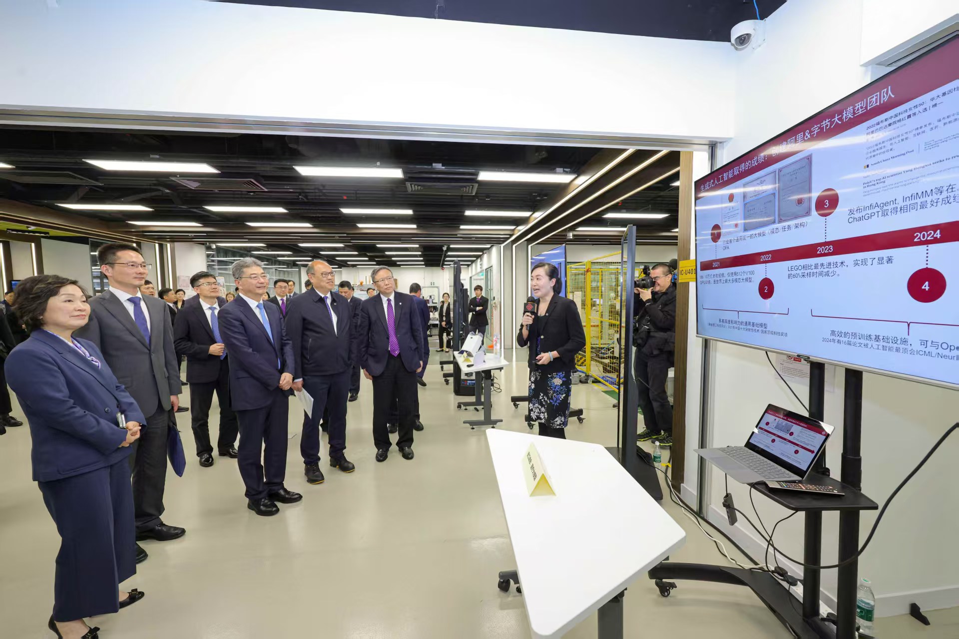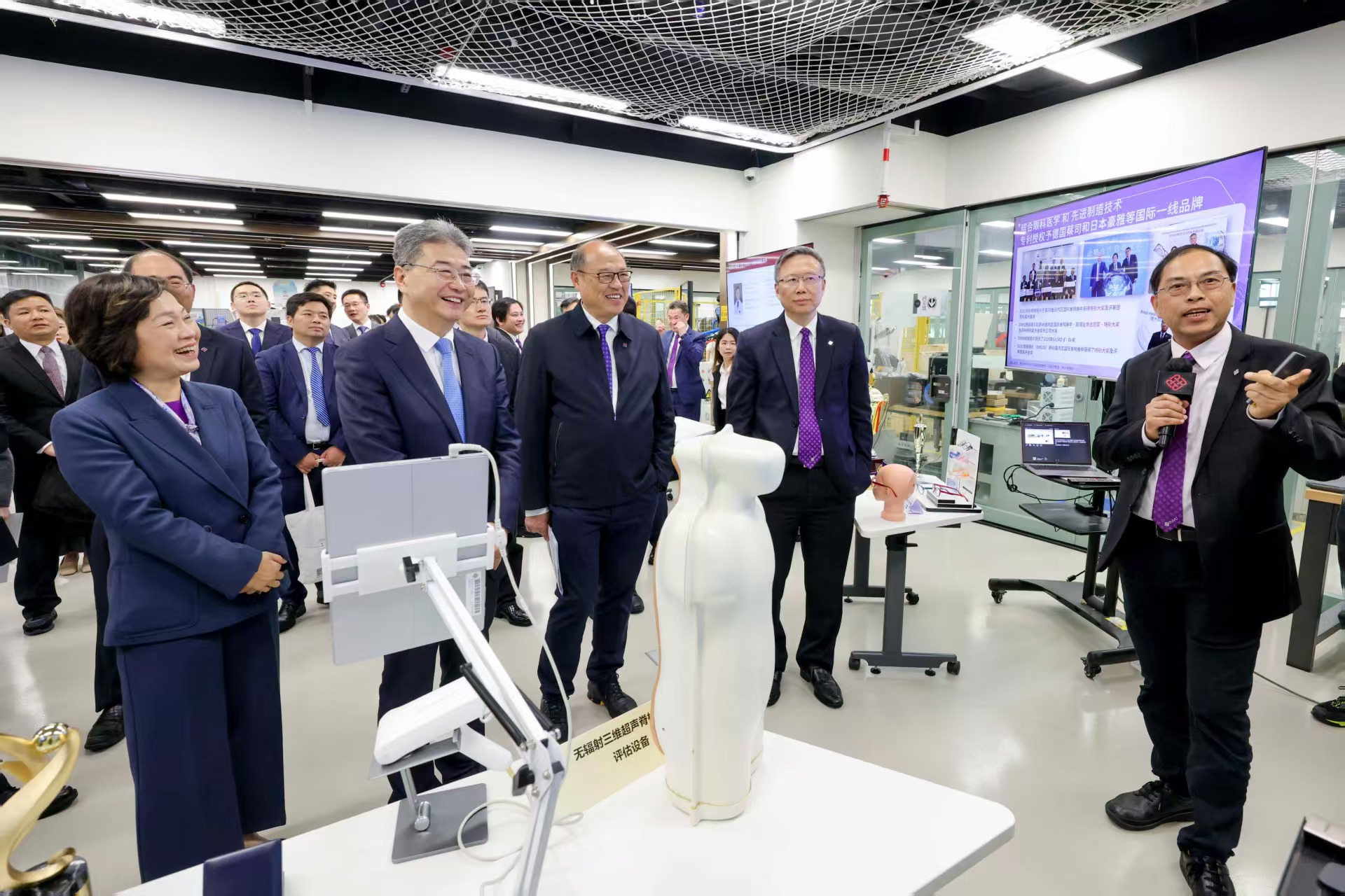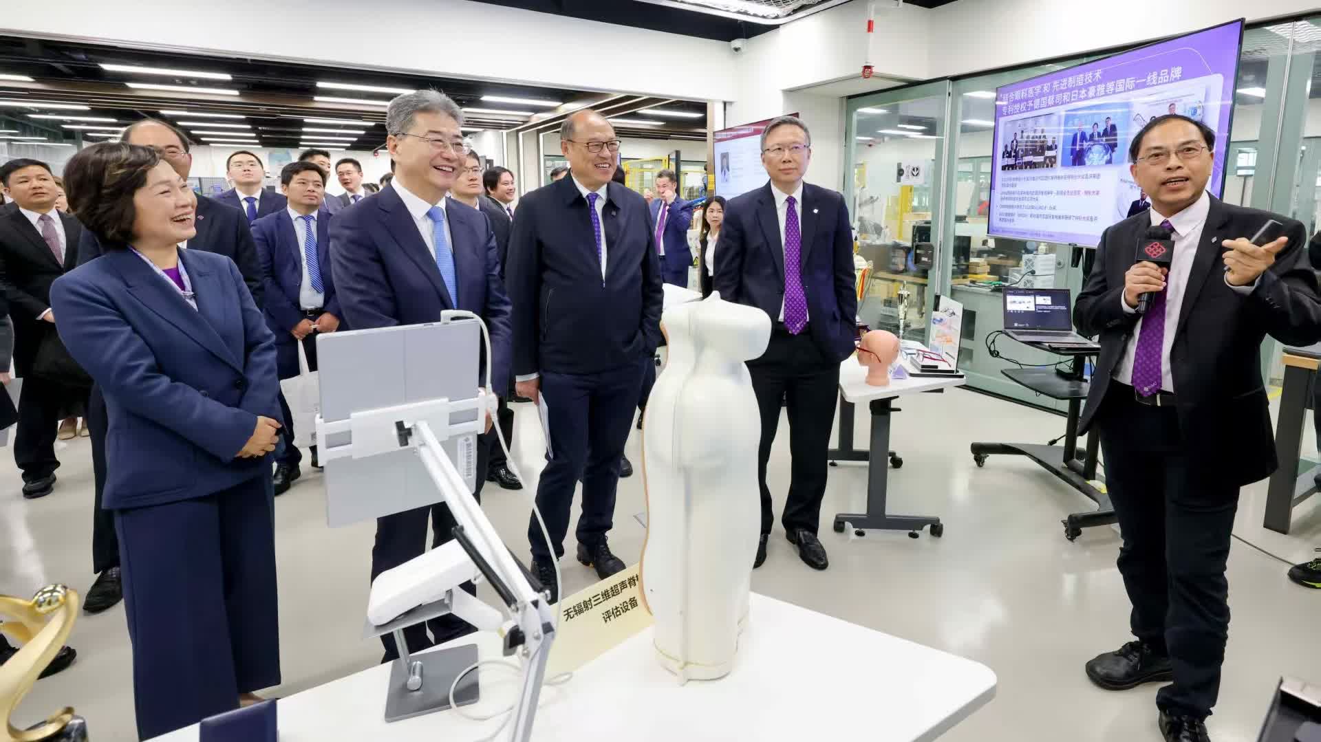 在理大校董會主席林大輝、校長滕錦光及一眾領導層陪同下,訪問團到訪理大工業中心人工智能機器人實驗室,並由理大學者介紹和展示多個醫學、健康和人工智能相關的創新科技項目。當中包括人工智能糖尿眼篩查系統、可應用於癌症的醫療大模型、控制兒童近視加深的近視離焦技術、肝纖維化和脂肪肝評估系統等。